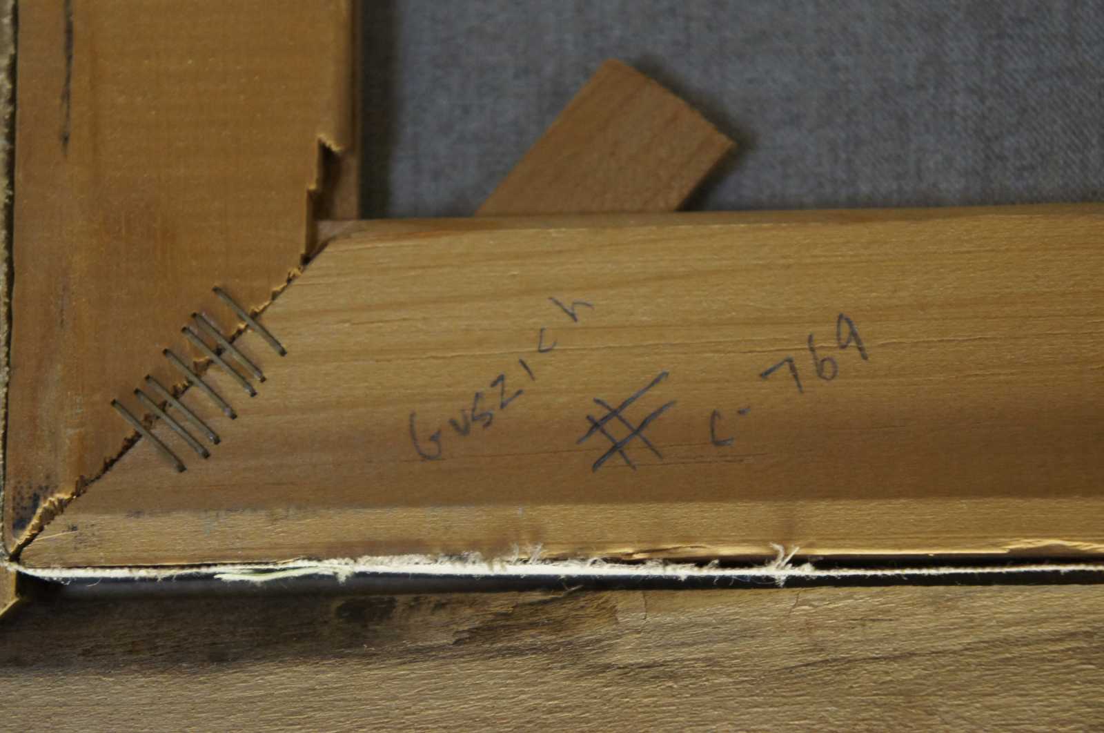 Vintage 20th century oil on canvas painting by Hungarian artist Jeno Gussich (1905 - ), showing an old man with white hair and beard, wearing a dark green velvet smock with an Elizabethan style lace collar and red beret.