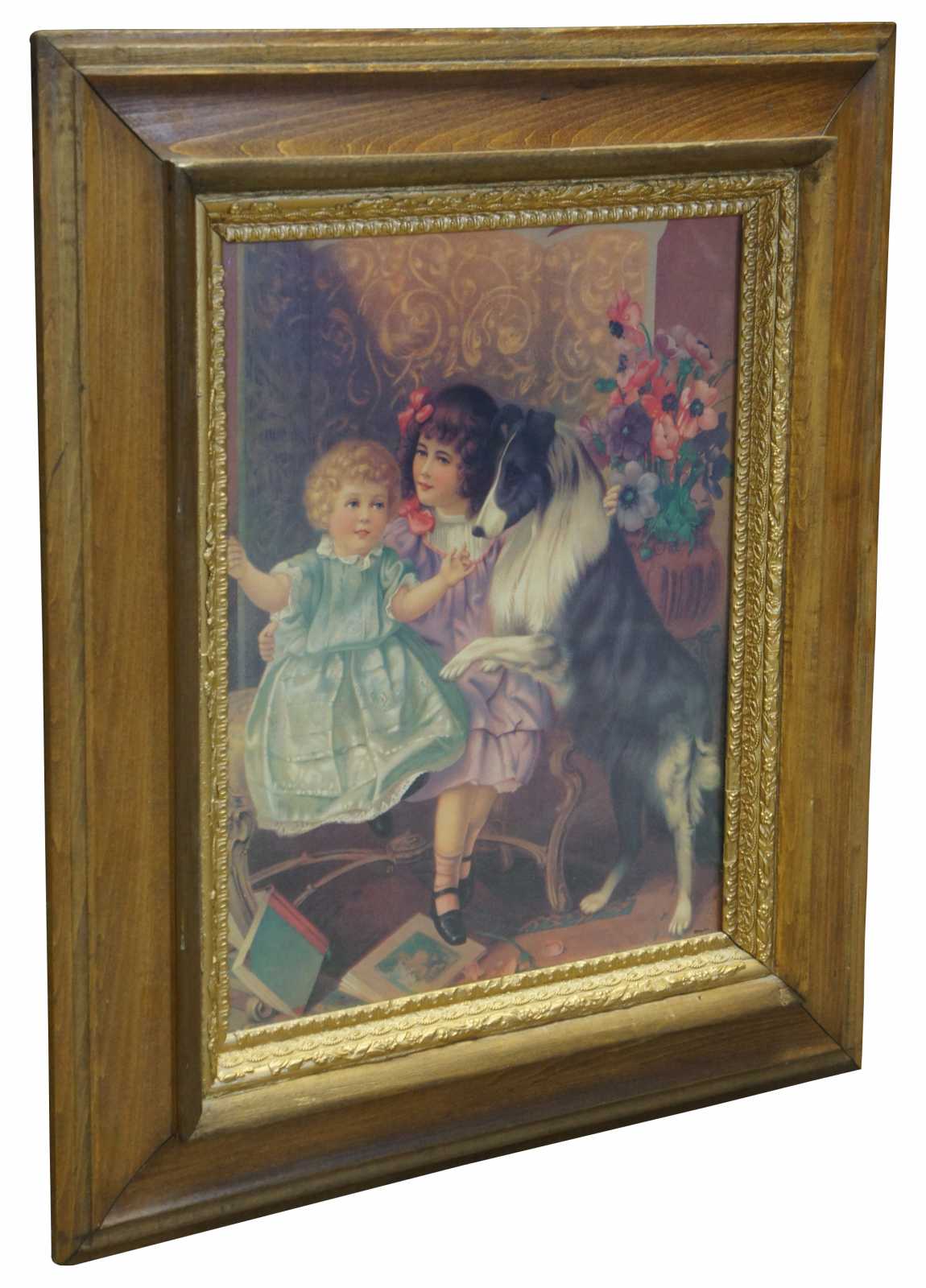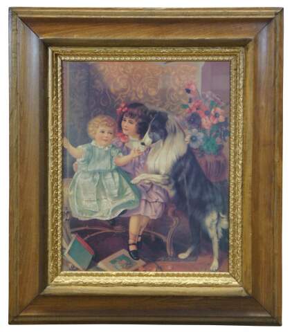 Antique Victorian lithograph print of an illustrated scene of two young girls on a settee with a rough collie.