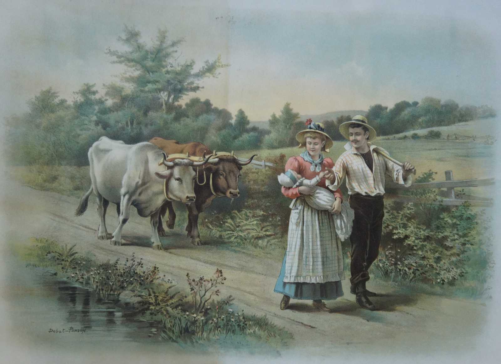 Antique Victorian chromolithograph print titled “After Marriage” by Edouard Debat-Ponsan, featuring a pastoral landscape scene of a couple with a baby walking down a road followed by two oxen. “Édouard Debat-Ponsan (Toulouse, 25 April 1847 – Paris, 29 January 1913) was a French academic painter noted for his allegorical works, scenes of peasant life and Orientalist works. A pupil of Cabanel, Debat-Ponsan was famous for his portraits of wealthy citizens and politicians in Paris, paintings of ancient history and scenes of peasant life. As a Republican and veteran of the War of 1870, Debat-Ponsan engaged in the struggle for rehabilitation of Captain Alfred Dreyfus, he exhibited his allegorical painting Vérité sortant du puits (shown here) at the 1898 Salon, [1] later offered to Émile Zola.