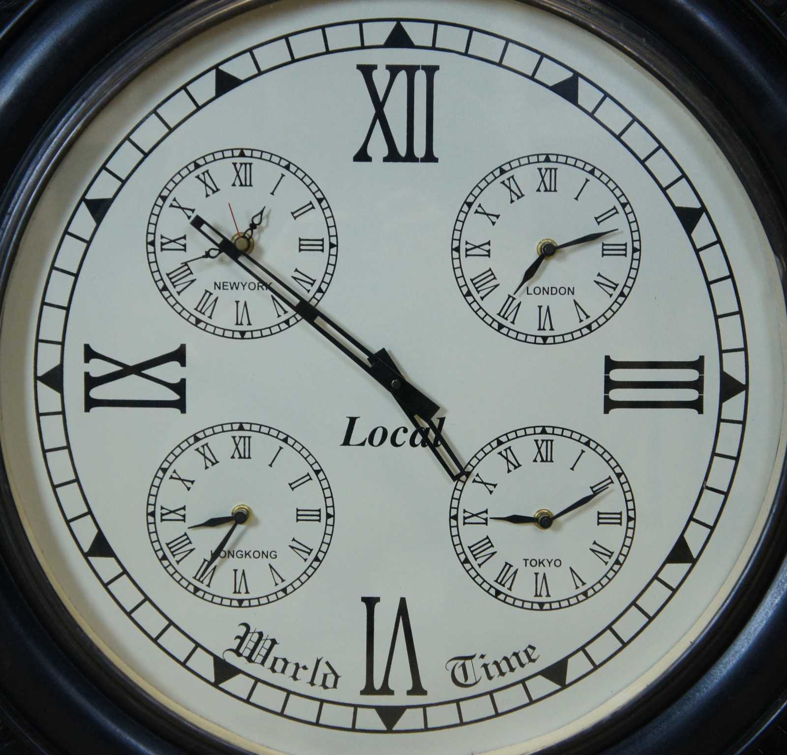 Battery operated local and world time wall clock with round beveled black wood frame and independently set faces for New York, London, Tokyo and Hong Kong.