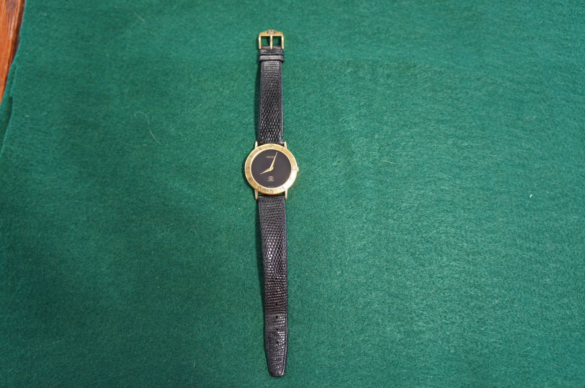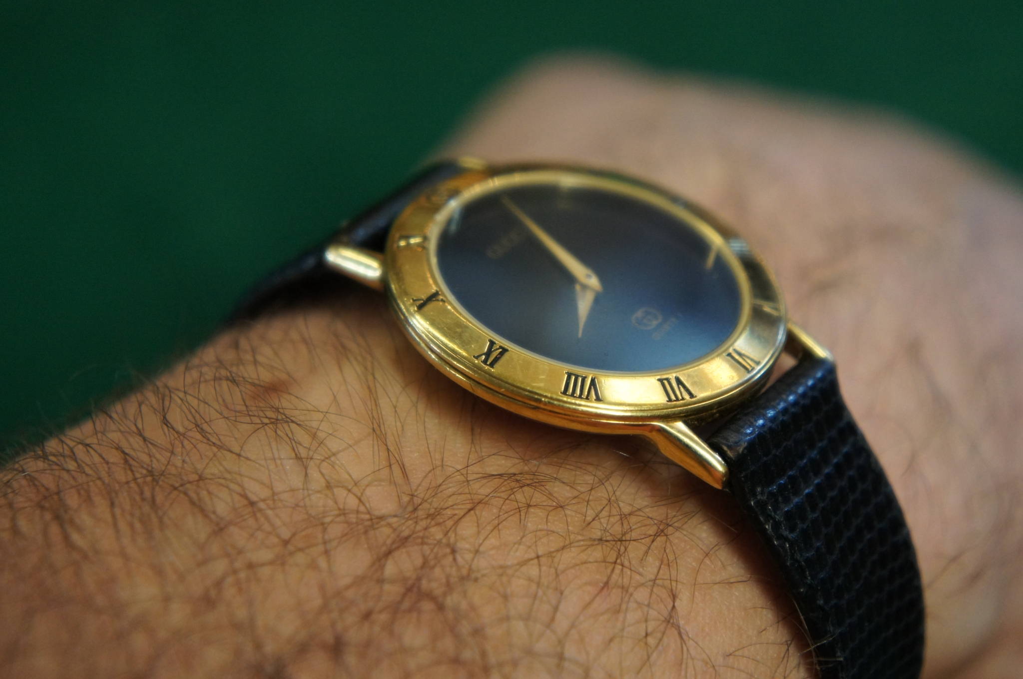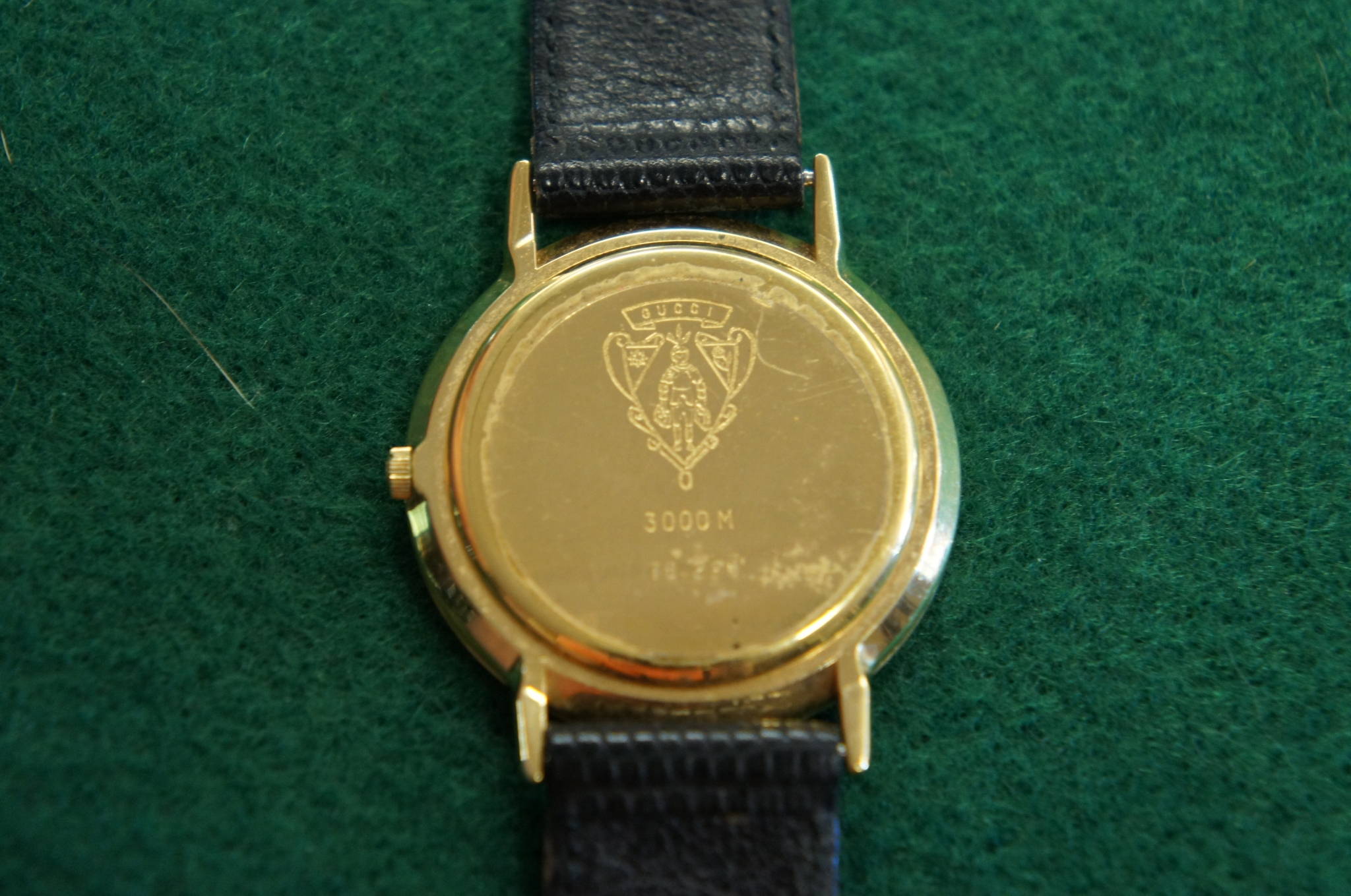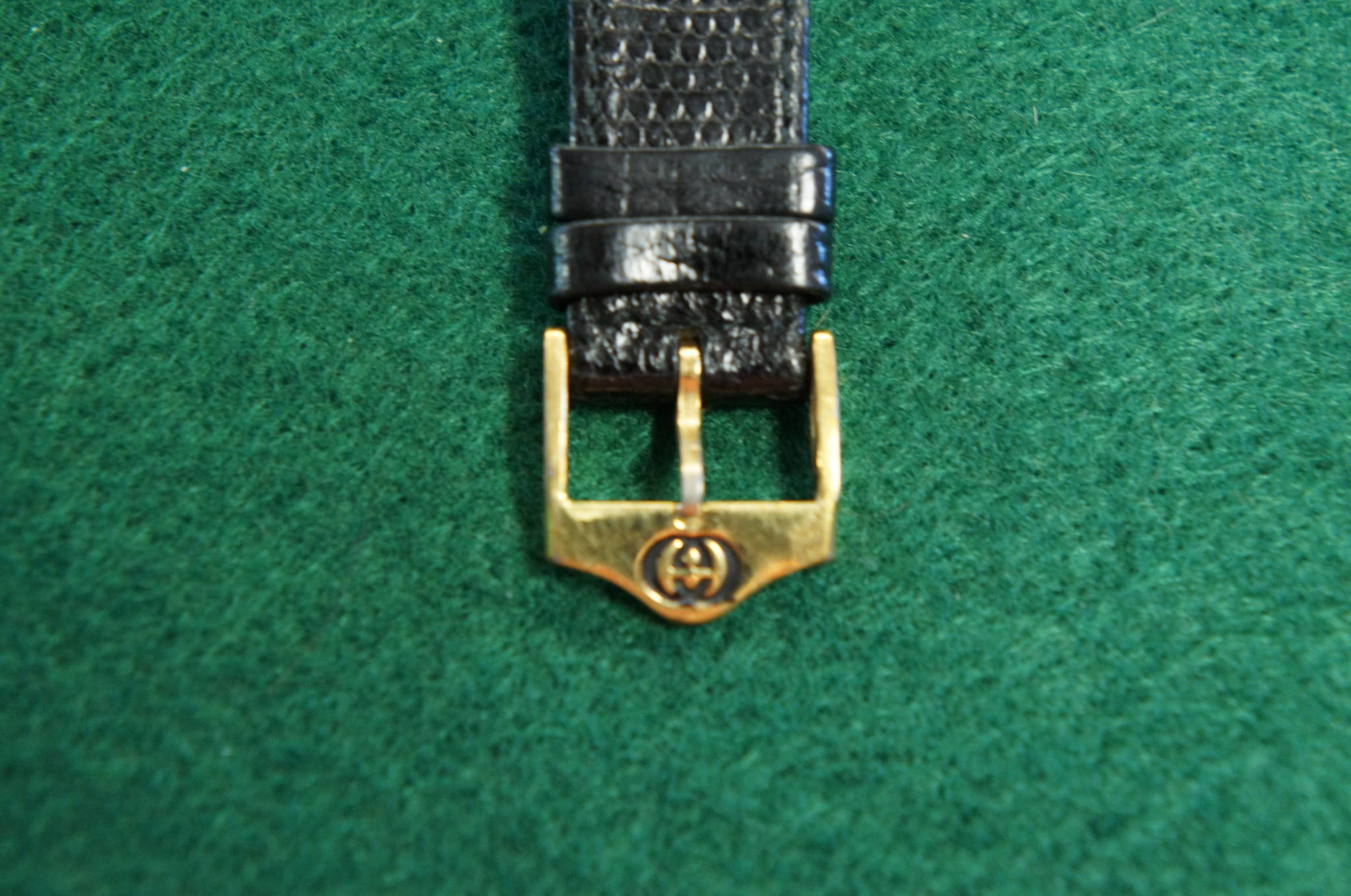 This is a very nice vintage Gucci watch. This was originally made for a man, but in todays times could also be worn by a female. It is gold plated with a black leather band. Would make an excellent gift or addition to any collection.