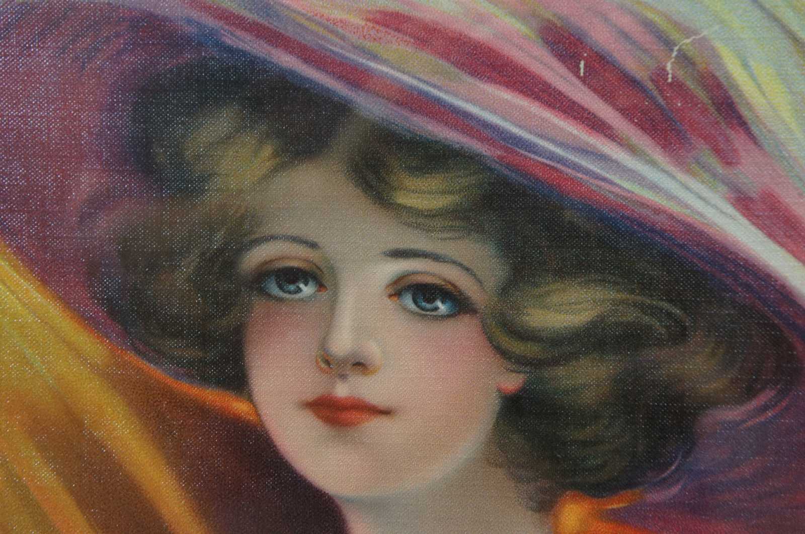 Vintage expressionist framed print of a Victorian woman in a pink dress and hat; artist initials “JHK” in the lower corner.