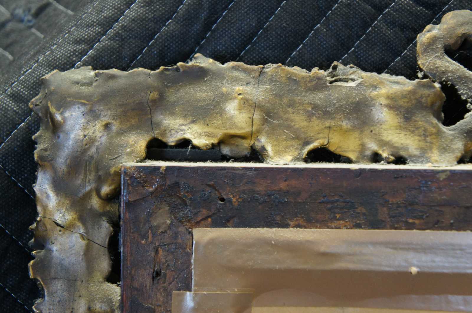 Good Overall - Gentle wear to frame/some cracks in giltwood; mirror loose in frame; print darkened/discolored; minor spots/silver loss to mirror; see pictures