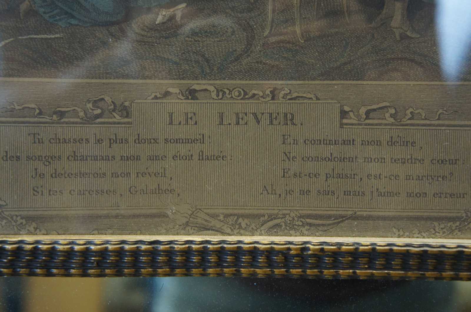 Antique Louis XVI mahogany trumeau wall mirror topped with a 1774 hand colored engraving titled “Le Lever” by Antoine Louis Romanet (1742-1810, French engraver and miniaturist) after Sigmund Freudenberger. “Sigmund Freudenberger (16 June 1745 – 15 November 1801) was a Swiss painter. Freudenberger was the son of a lawyer, and studied as a portraitist. He lived from 1765 to 1773 in Paris, where he worked with François Boucher. He then founded in a private art school in Bern and was known as "Little Master" for his genre-like depictions of rural life. “