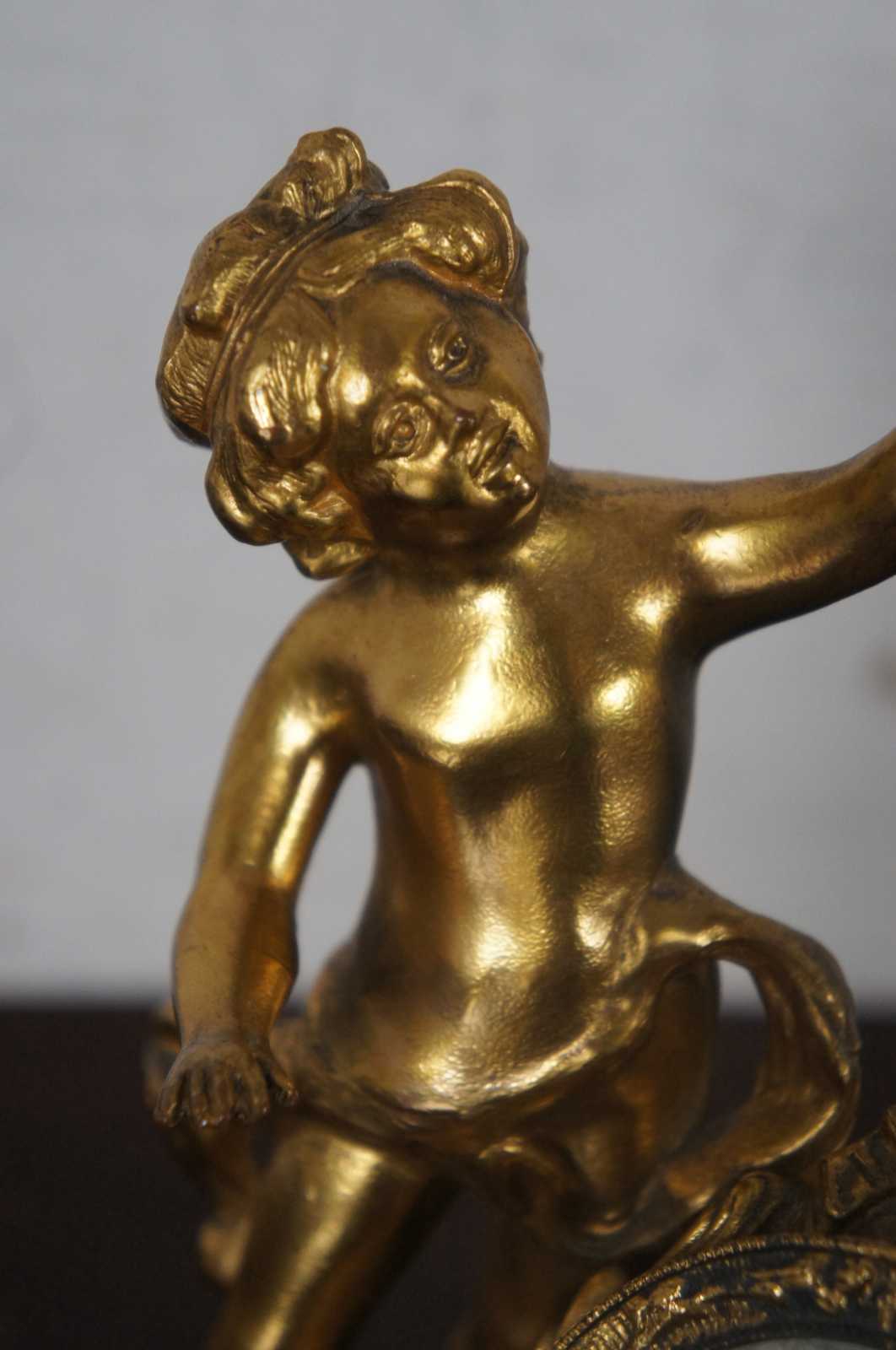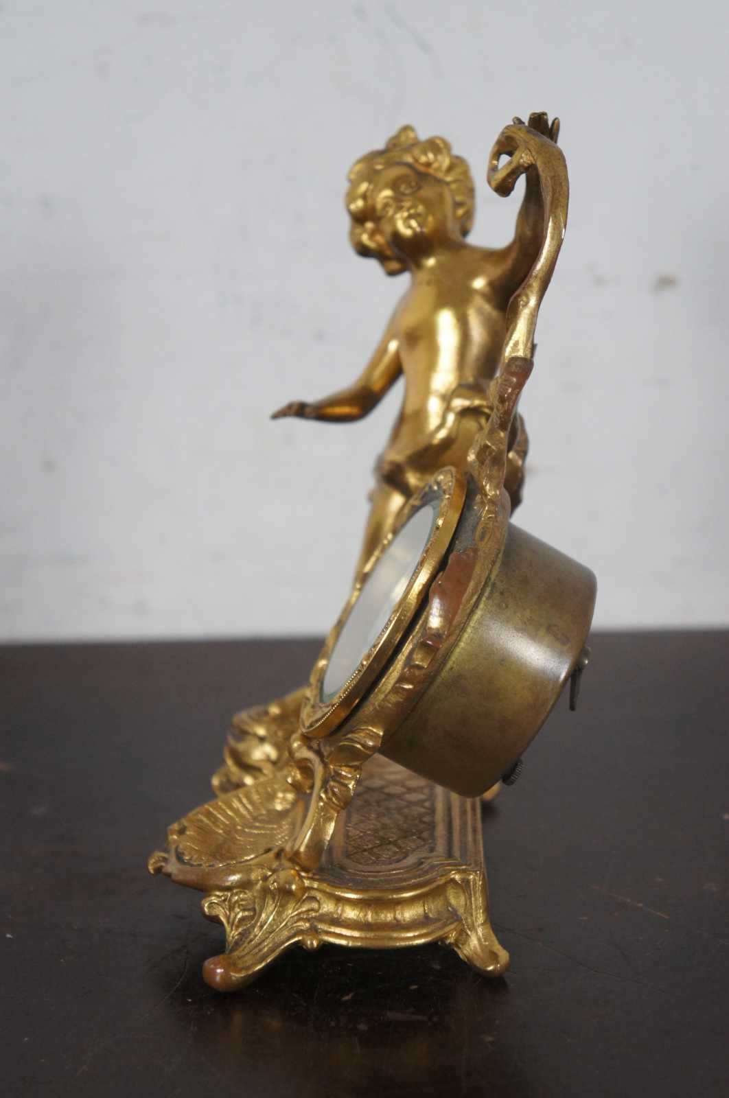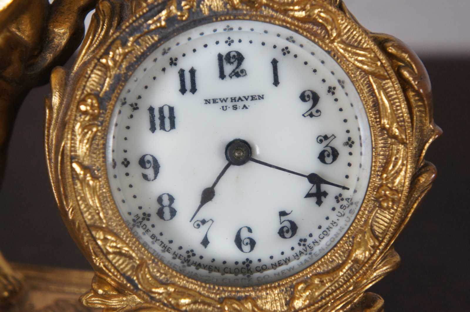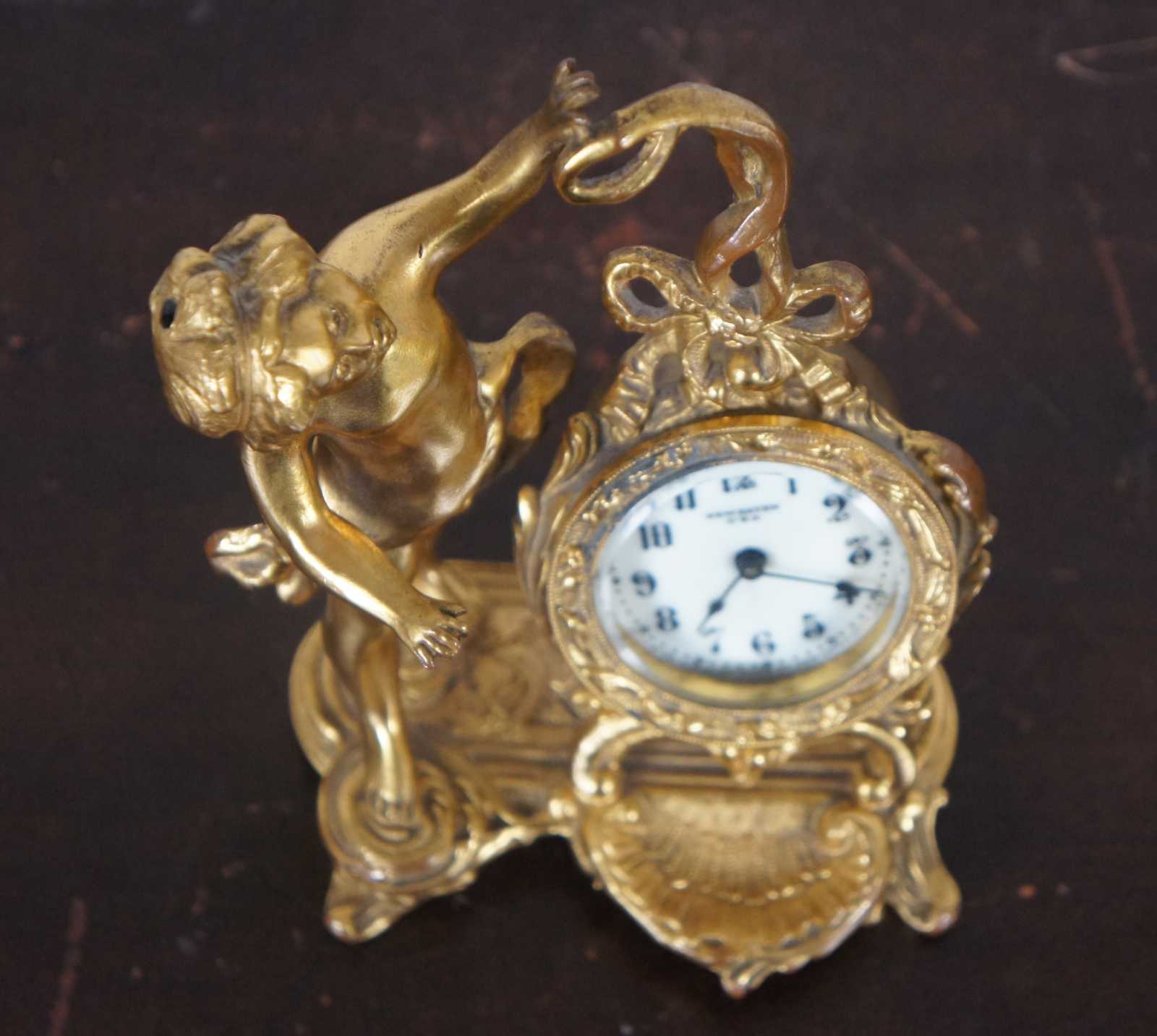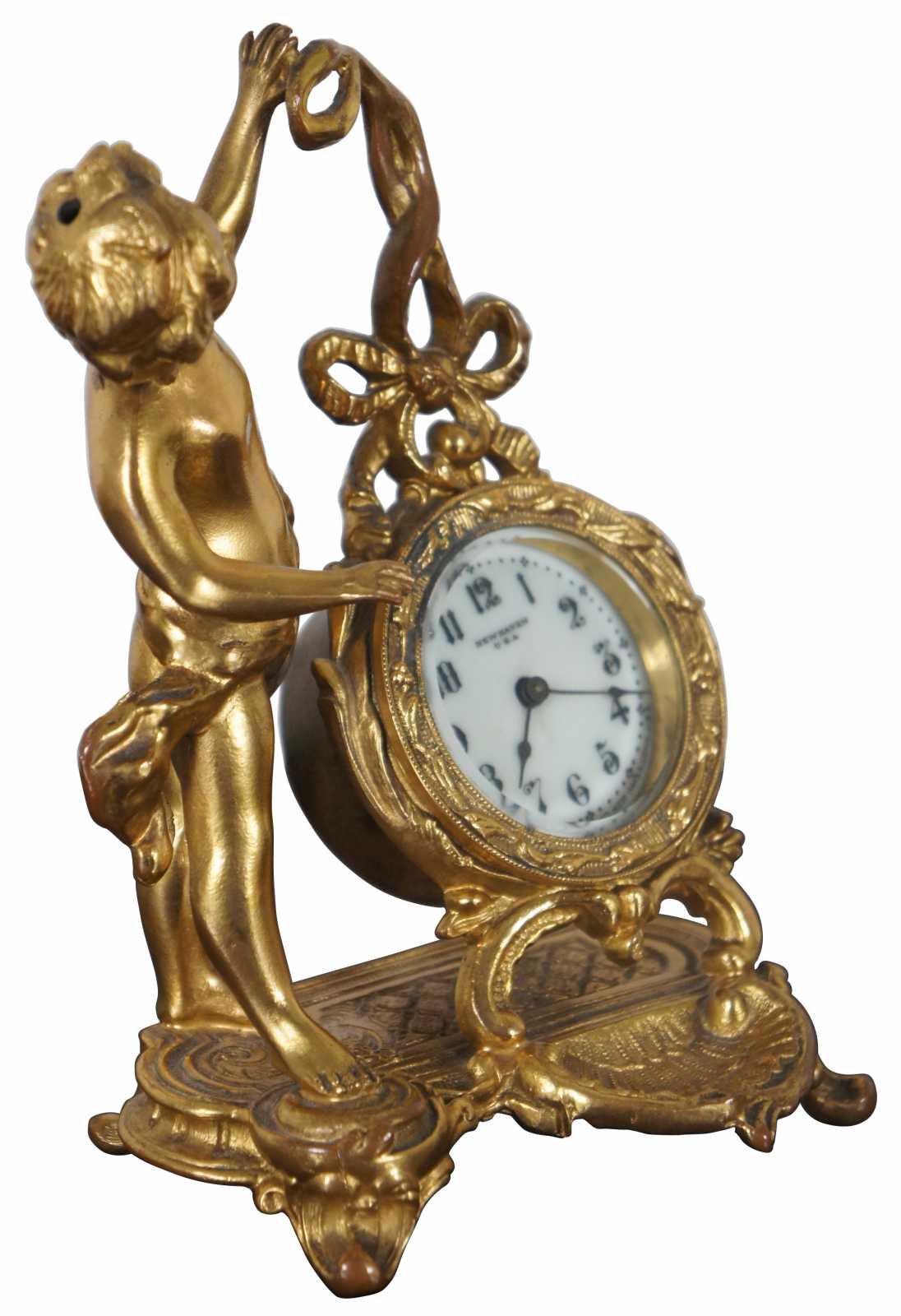 Antique art nouveau gilt metal cherub tabletop clock by the New Haven Clock Company.