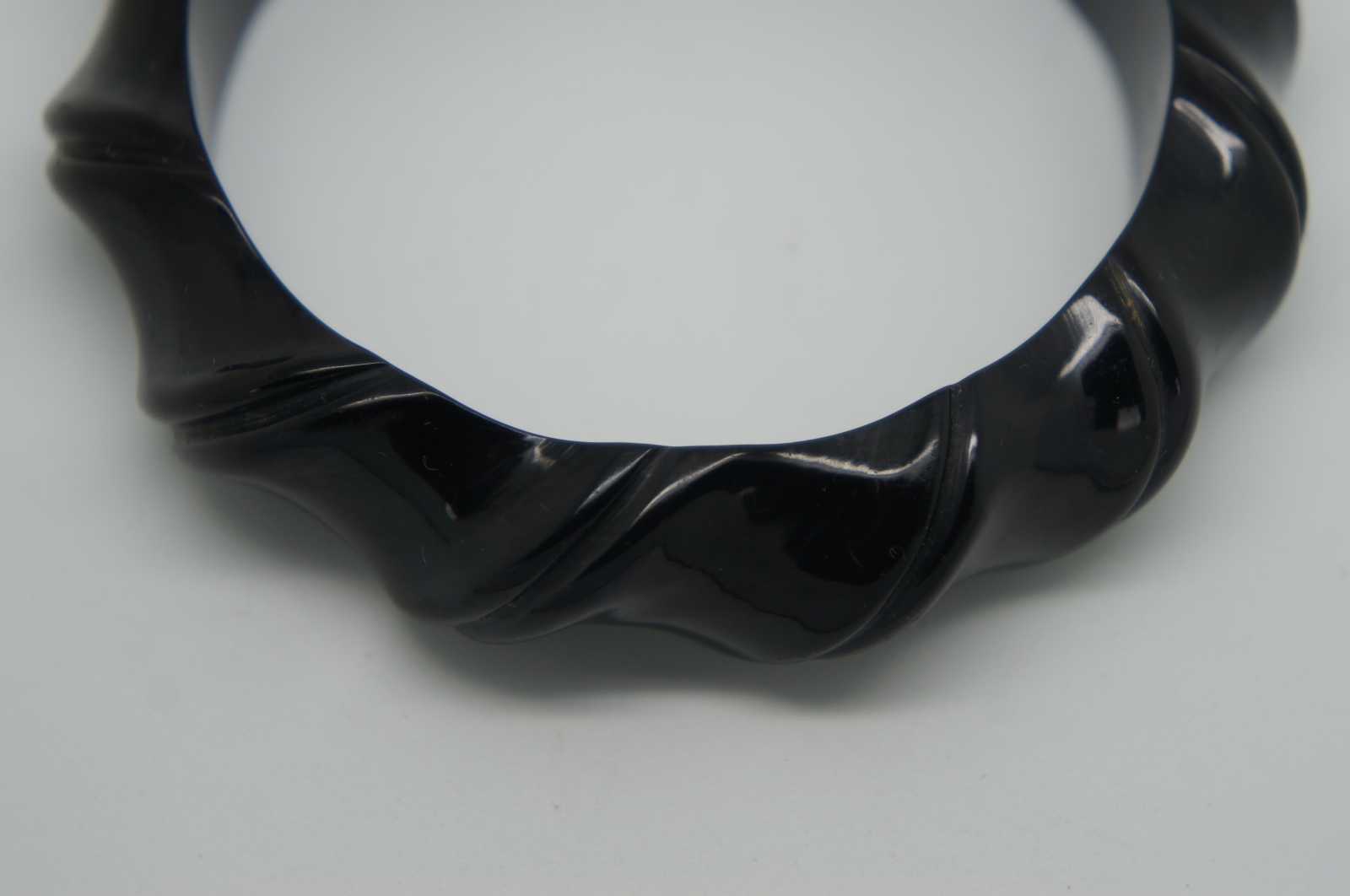 Early to mid 20th century black Bakelite bangle bracelet carved to resemble slightly twisted bamboo.