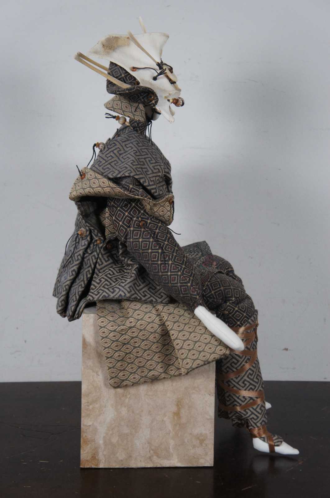 Vintage doll figurine dressed as a Japanese nobleman or samurai with a hat made from a bird or chicken’s pelvic bone and beaded and stone accents.