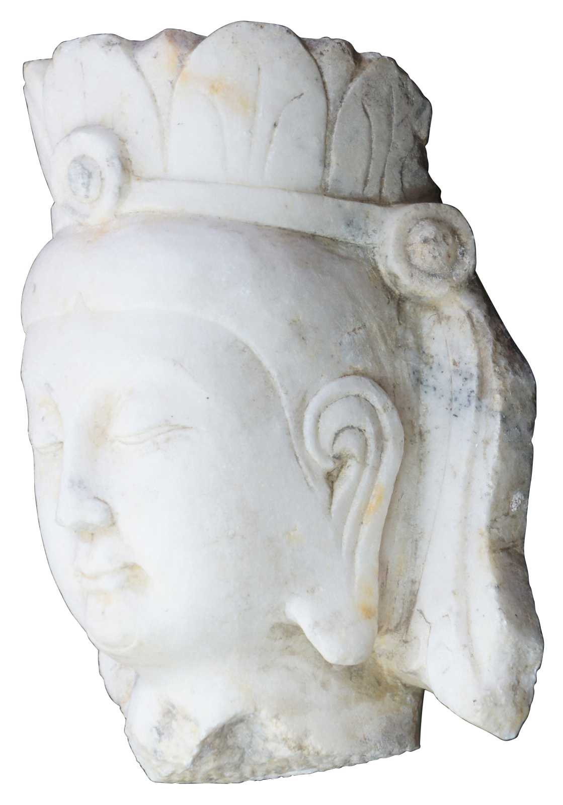 Antique carved Kwan Yin Buddha head sculpture or statue. Made of heavy white marble featuring a peaceful expression. Quan Yin (Kuan Yin or Guan Yin) is the bodhisattva of great compassion. A bodhisattva is a human being that has made a vow to dedicate all of their lifetimes to the enlightenment of all humankind. Bodhisattvas continue to reincarnate and return to the world to help guide others to enlightenment.