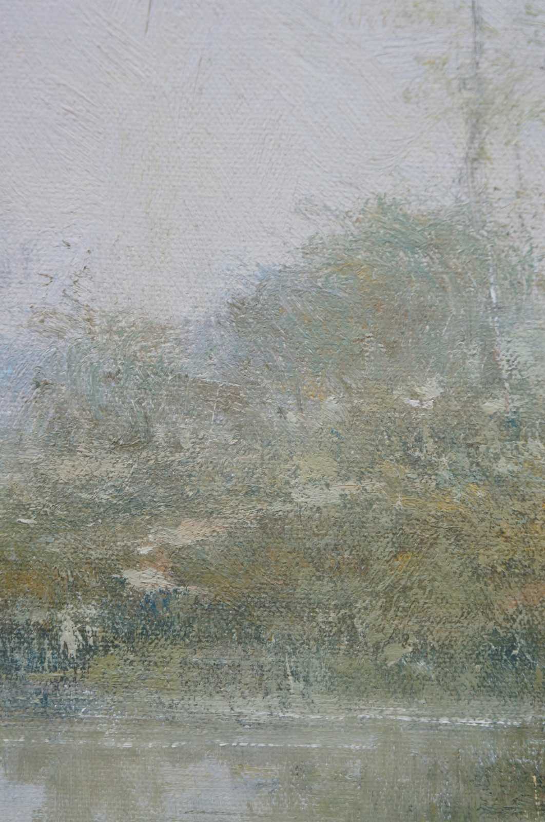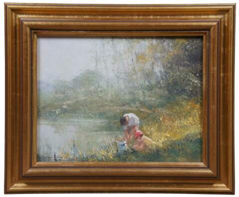 Impressionist oil on canvas landscape painting by Robert Hagan, showing a pair of figures next to a lake.“Born in 1947 and raised in the lush, languorous sub-tropical northern New South Wales, Australia and educated at Newcastle University, he communicates in a typical offhanded Aussie manner. Widely traveled with studios in Suffolk, England., San Diego, USA., Southport, Australia and Pattaya, Thailand, Robert goes about his art with confidence, humility and pragmatism. He explains, ""When you look at things you tend to concentrate on one element, a boy or girl at the waters edge, for example. It's hard to bring into meaniful vision the entire scene at the one occasion. It's all there, but its not defined and it's that which is peripheral to the starting point"". The key to impressionism is keying in the peripherel to the starting point"".