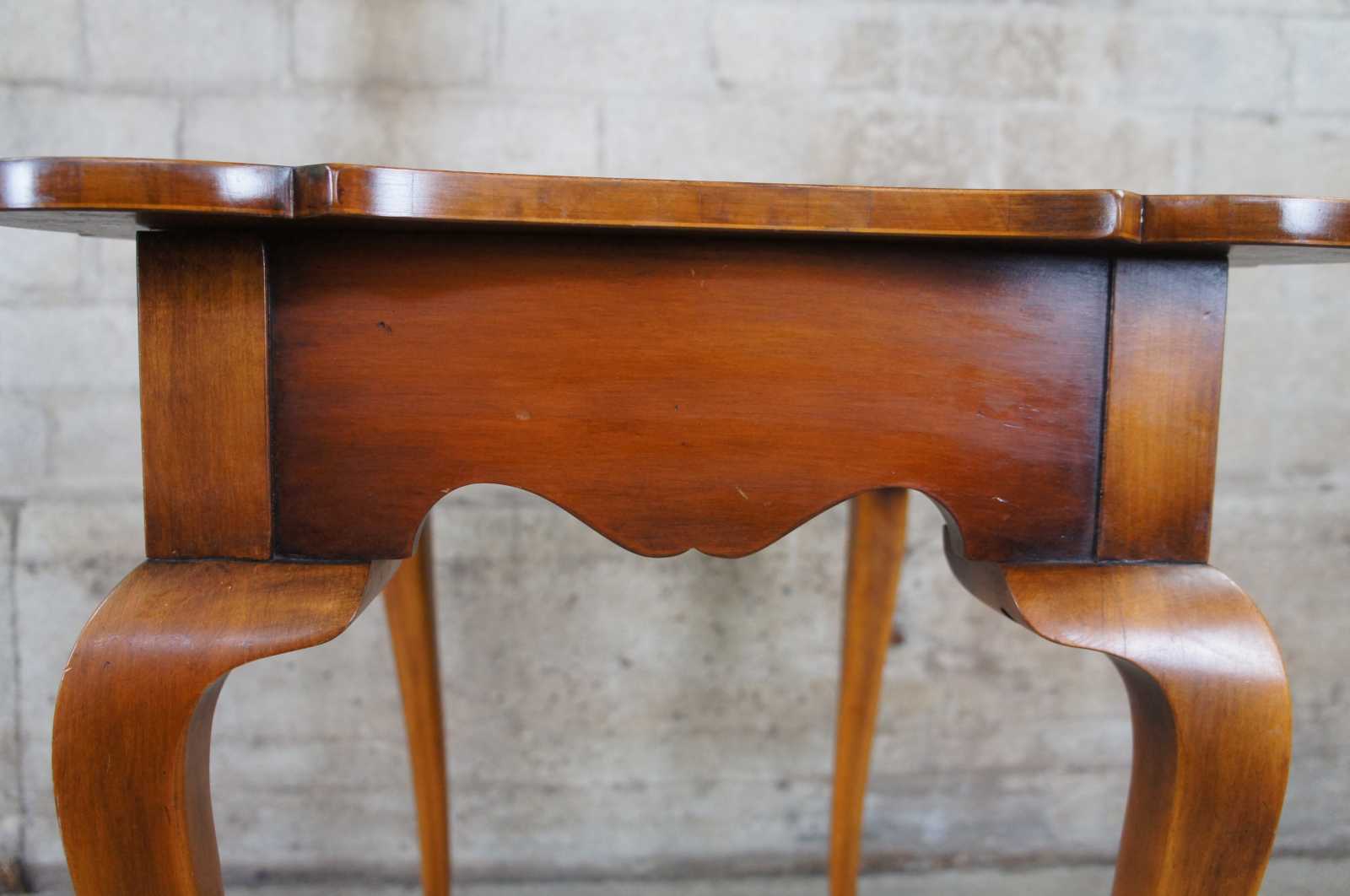 This elegant porringer table with its weightless appearance, and distinctive turret corners, illustrates one of the innovative forms created during the Queen Anne period. The rich patina and undisturbed one-board top make this table an exceptional reproduction of 18th century porringer form. Originally referred to as square tables or scalloped tables, the porringer form was inspired by English card tables with rounded corners. These durable moveable tables were perfect for activities such as tea drinking, while also useful for many other serving or entertaining needs.