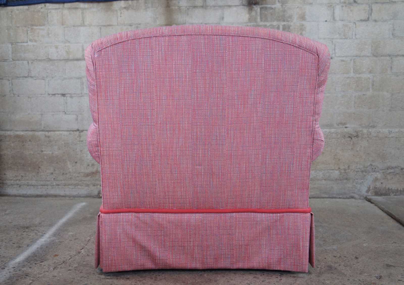 Vintage Edwards Furniture Inc club chair and ottoman featuring a pink upholstery with blue and white undertones, rolled arms and skirted legs.