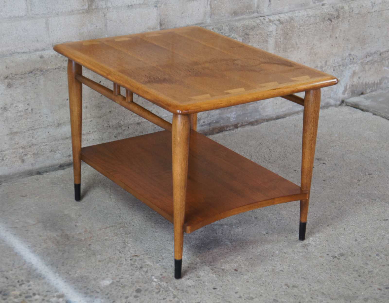 Circa 1966 Lane series 900-05 Acclaim side, end or accent table. A rectangular form made from walnut with a two tone top feturing tongue and groove design.
