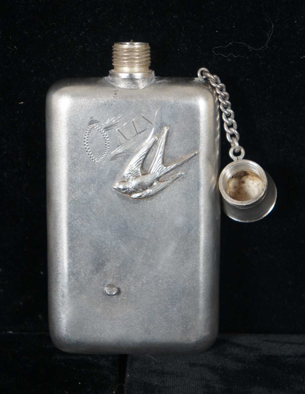 Antique repousse floral silver plate pocket flask with sparrow bird and engraved “Only” on the reverse.