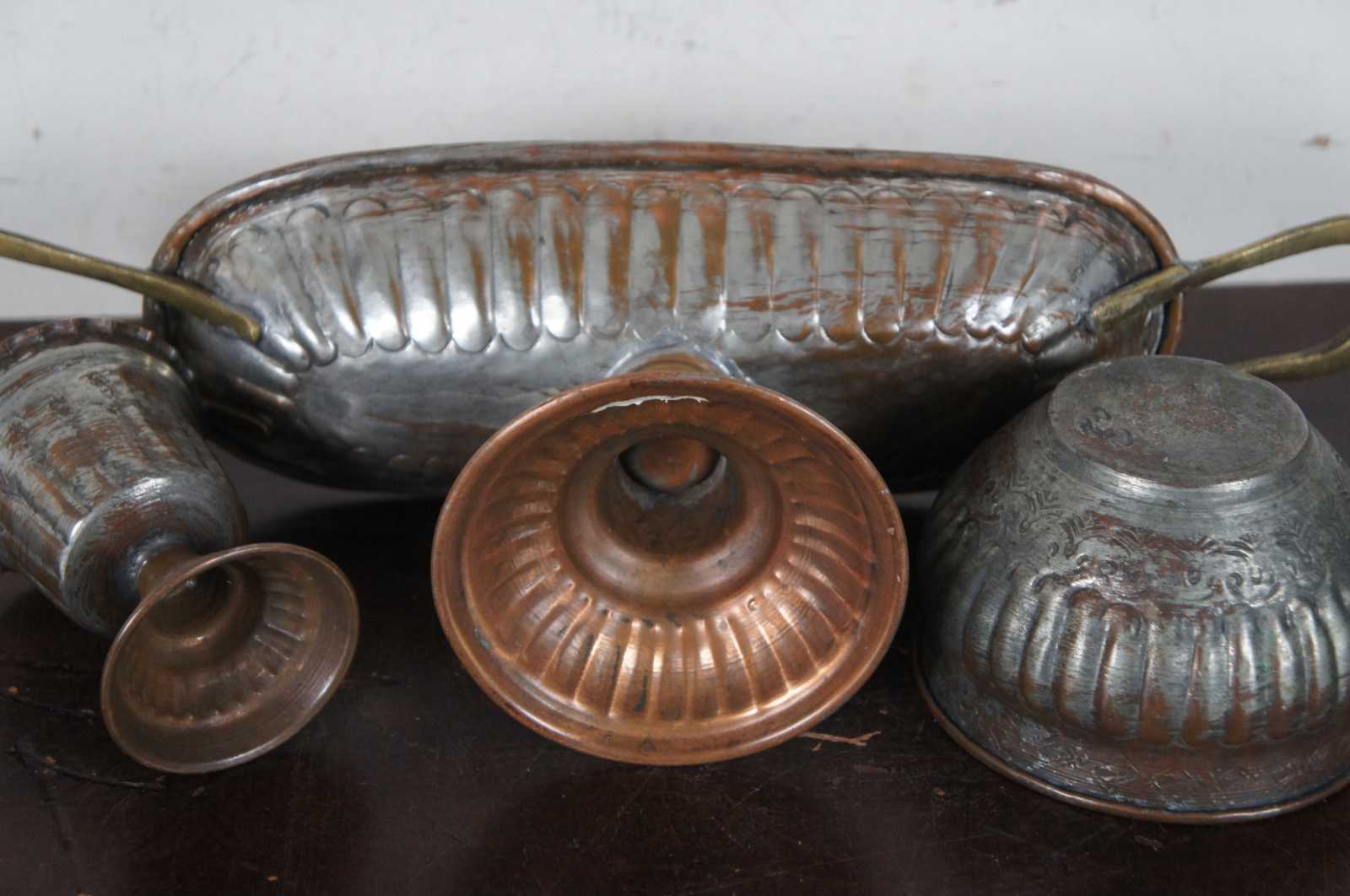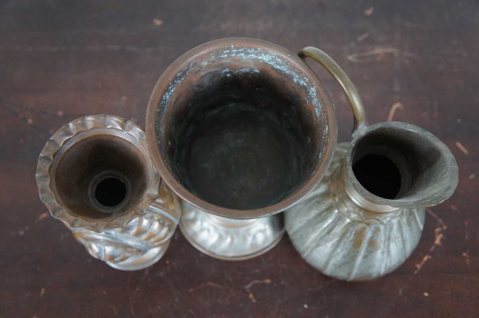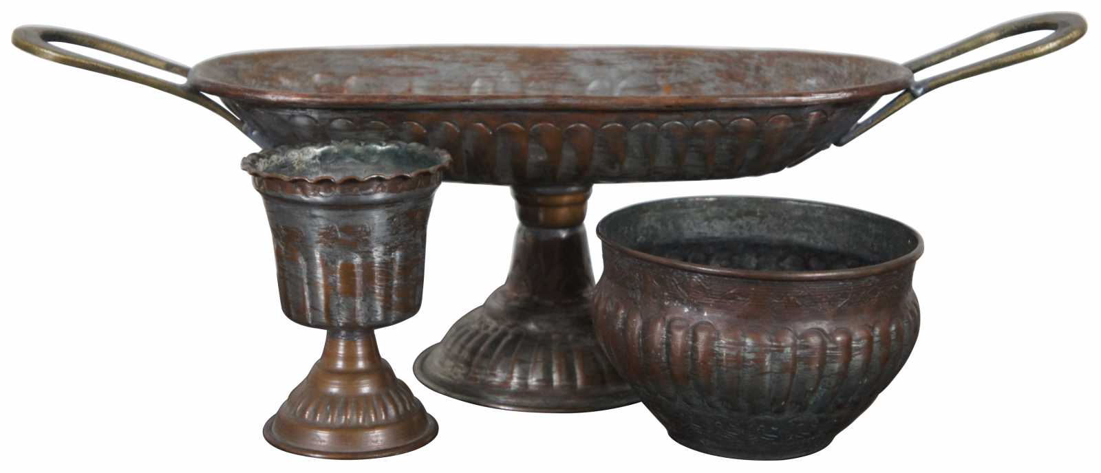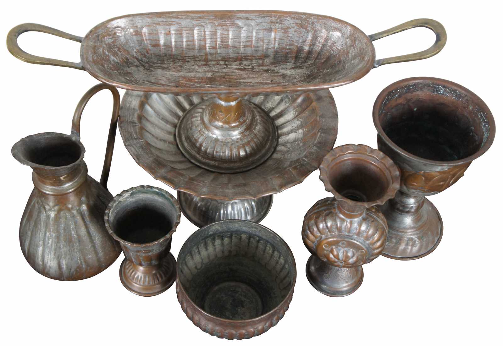 Lot of seven assorted vintage copper/tin pieces including two centerpiece compotes, a small pitcher, large goblet, small goblet, small planter and a vase. Only one hallmarked.