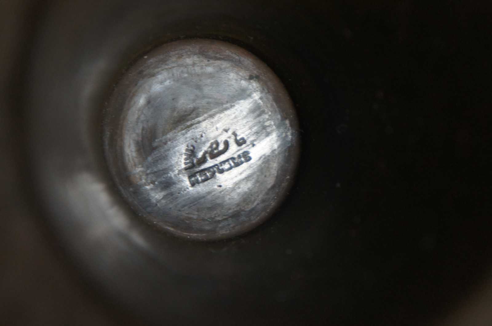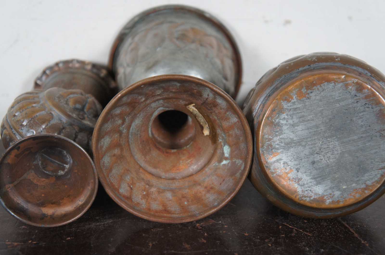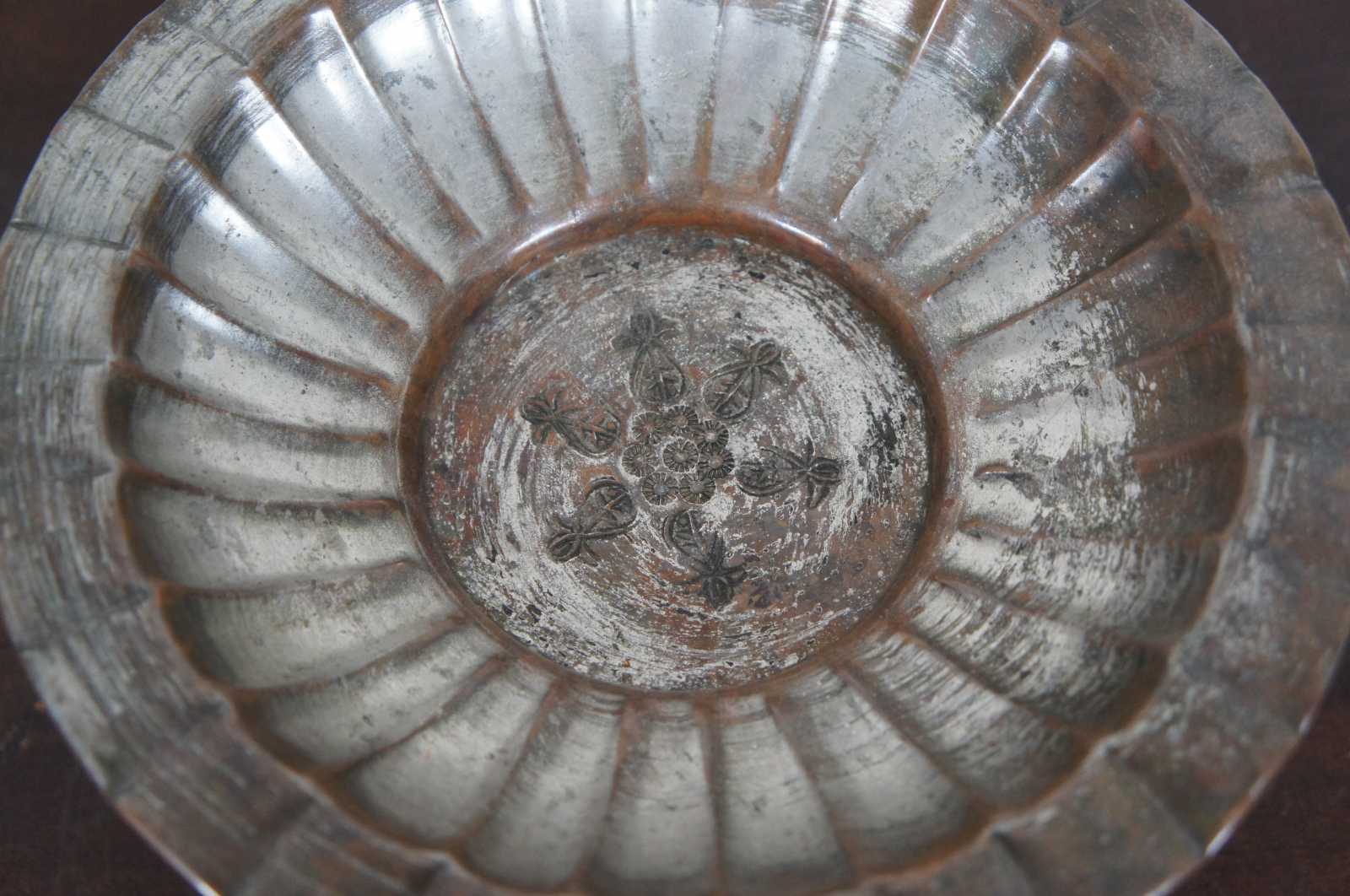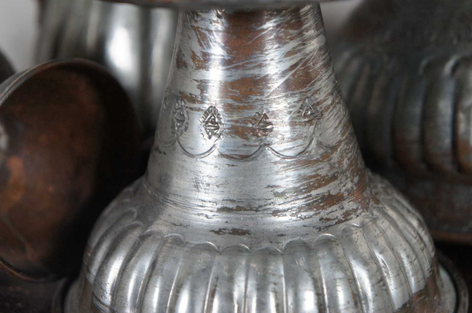 Lot of seven assorted vintage copper/tin pieces including two centerpiece compotes, a small pitcher, large goblet, small goblet, small planter and a vase. Only one hallmarked.