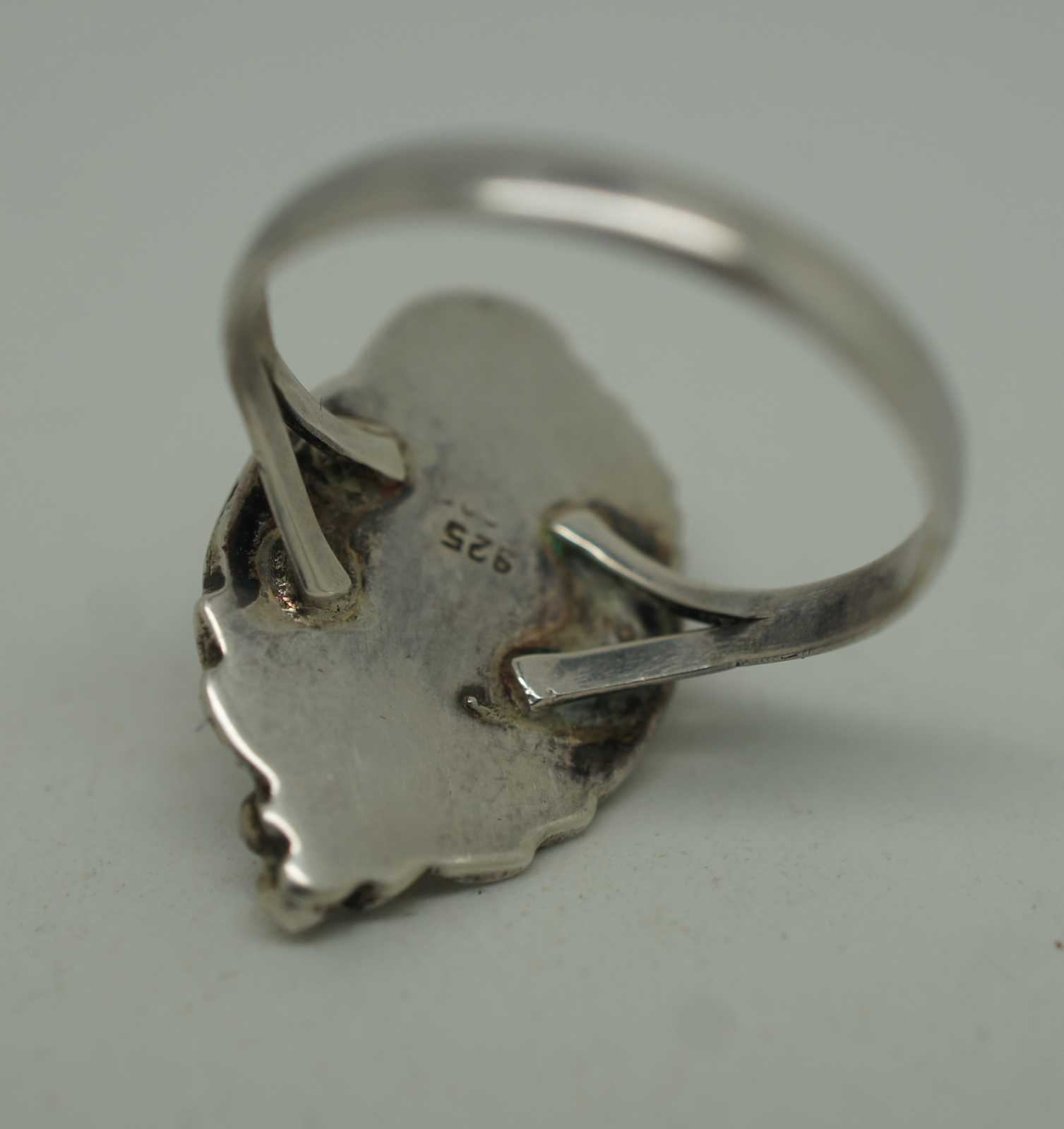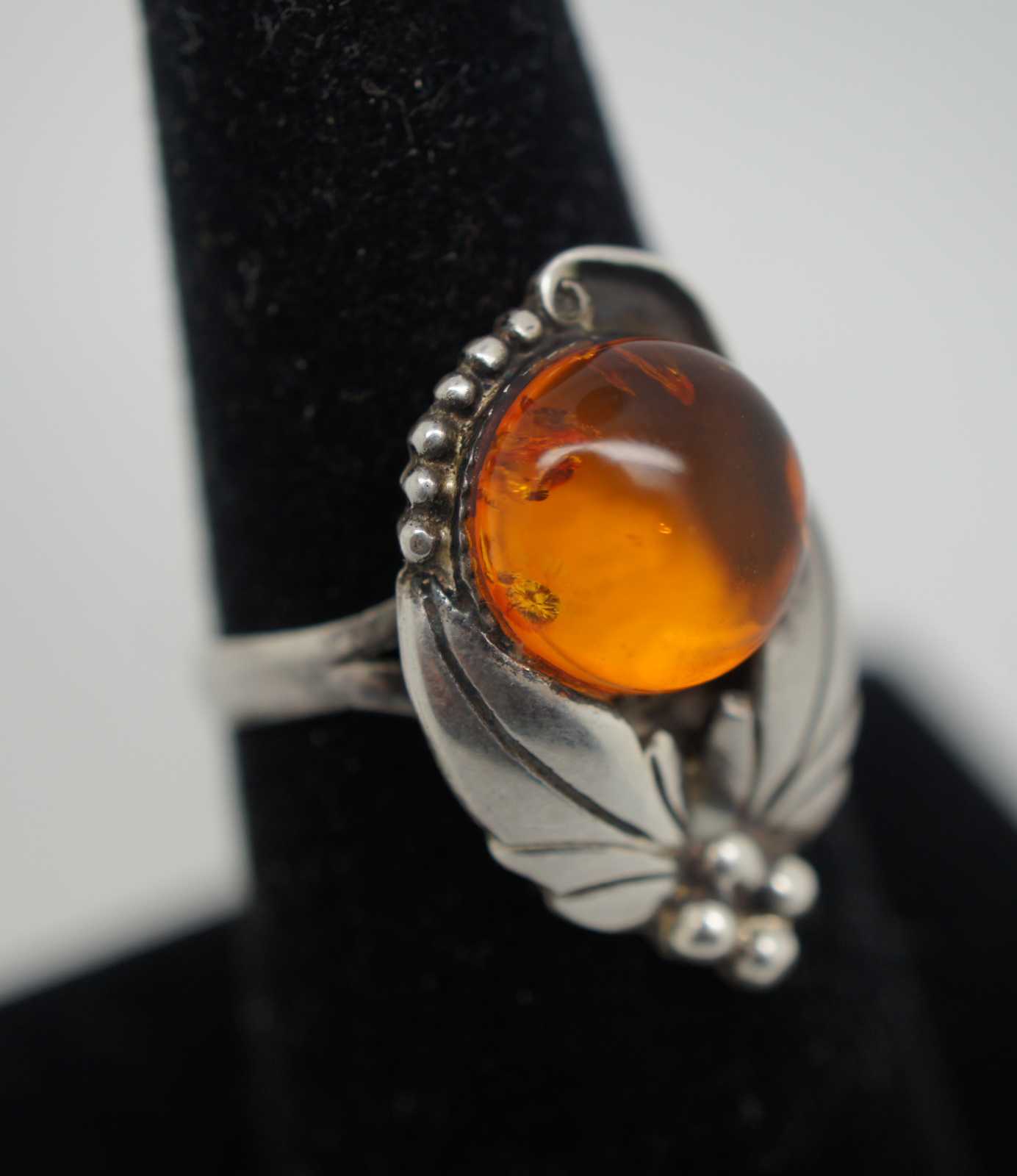 Antique Art Nouveau sterling silver 925 ring with a round polished Baltic amber stone flanked by leaves and berries. Size 8.5""