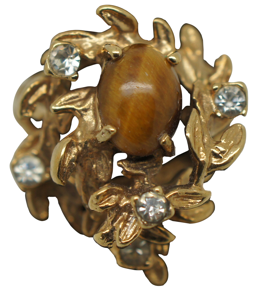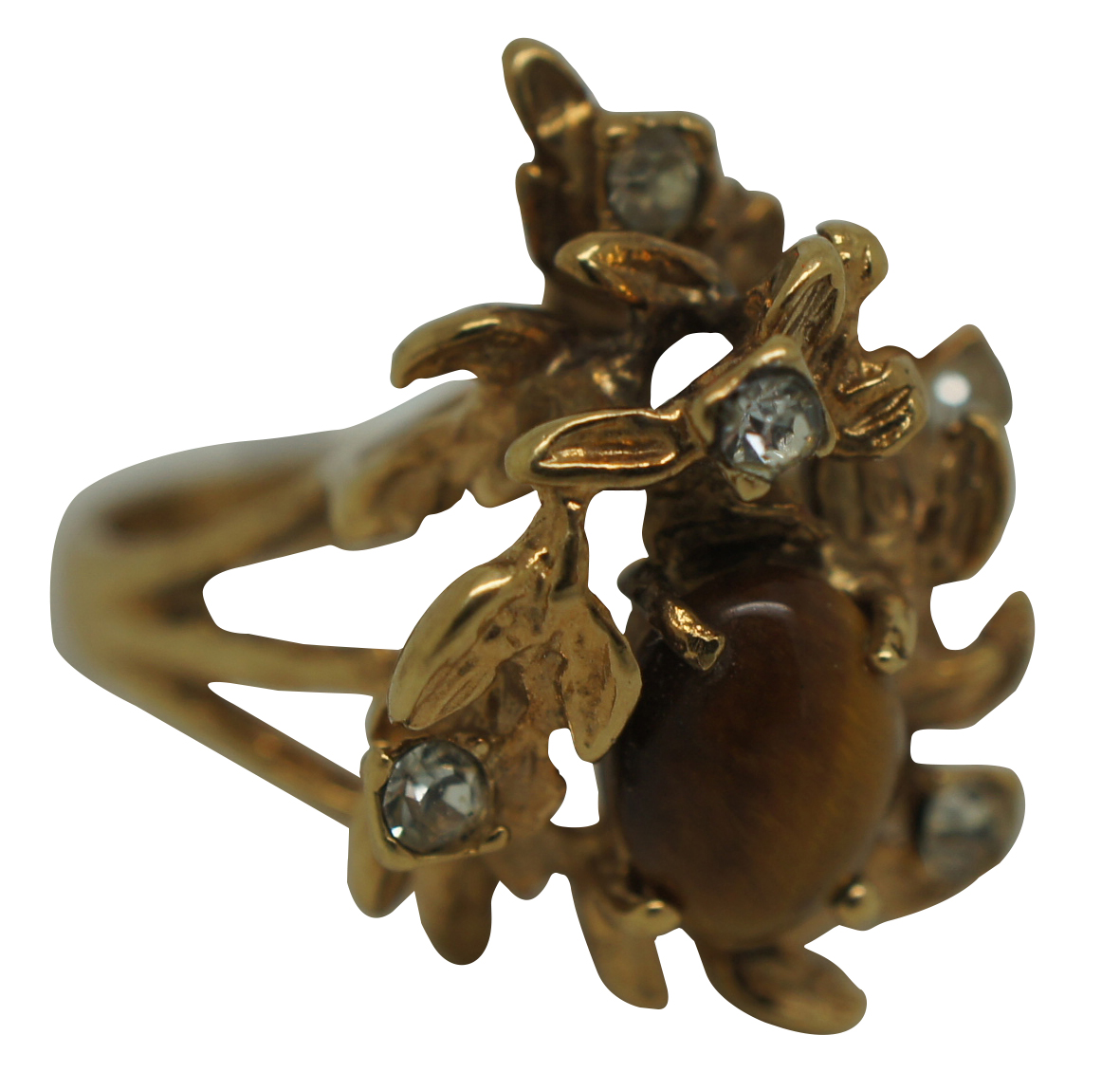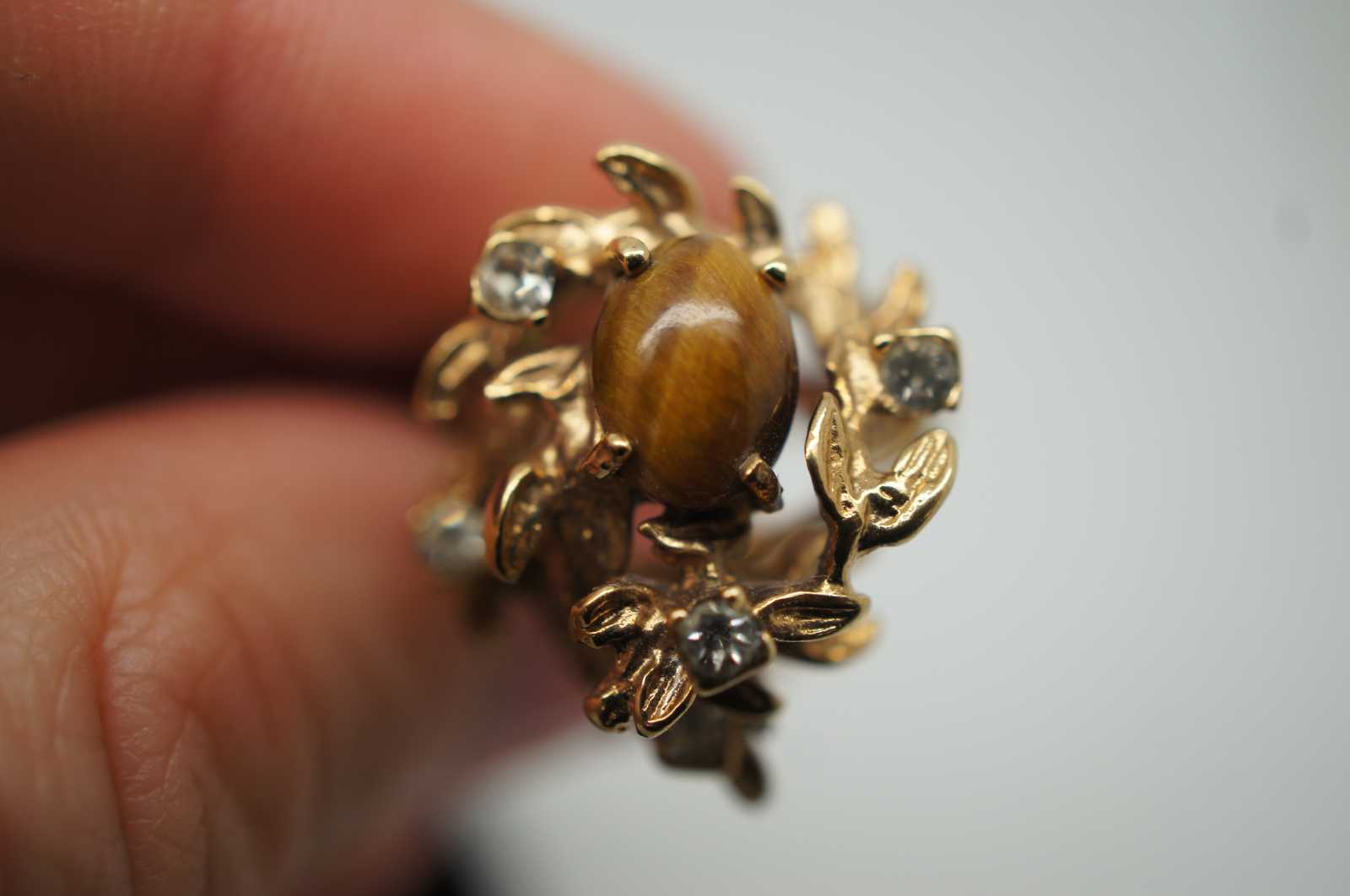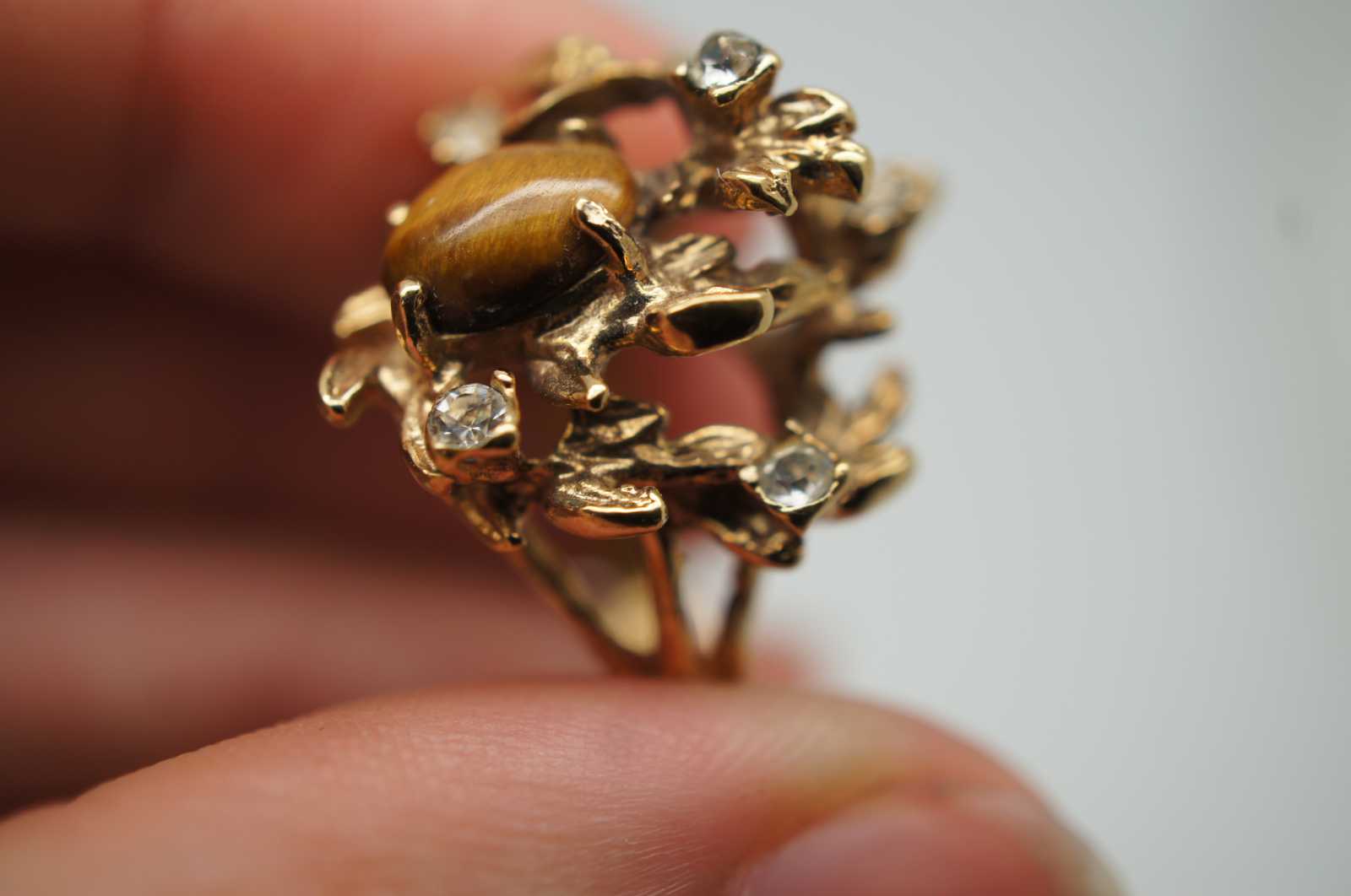 Vintage mid century 14k yellow gold HGE ring with a cabochon tigers eye and four rhinestone chips nestled in a setting of leaves and branches.
