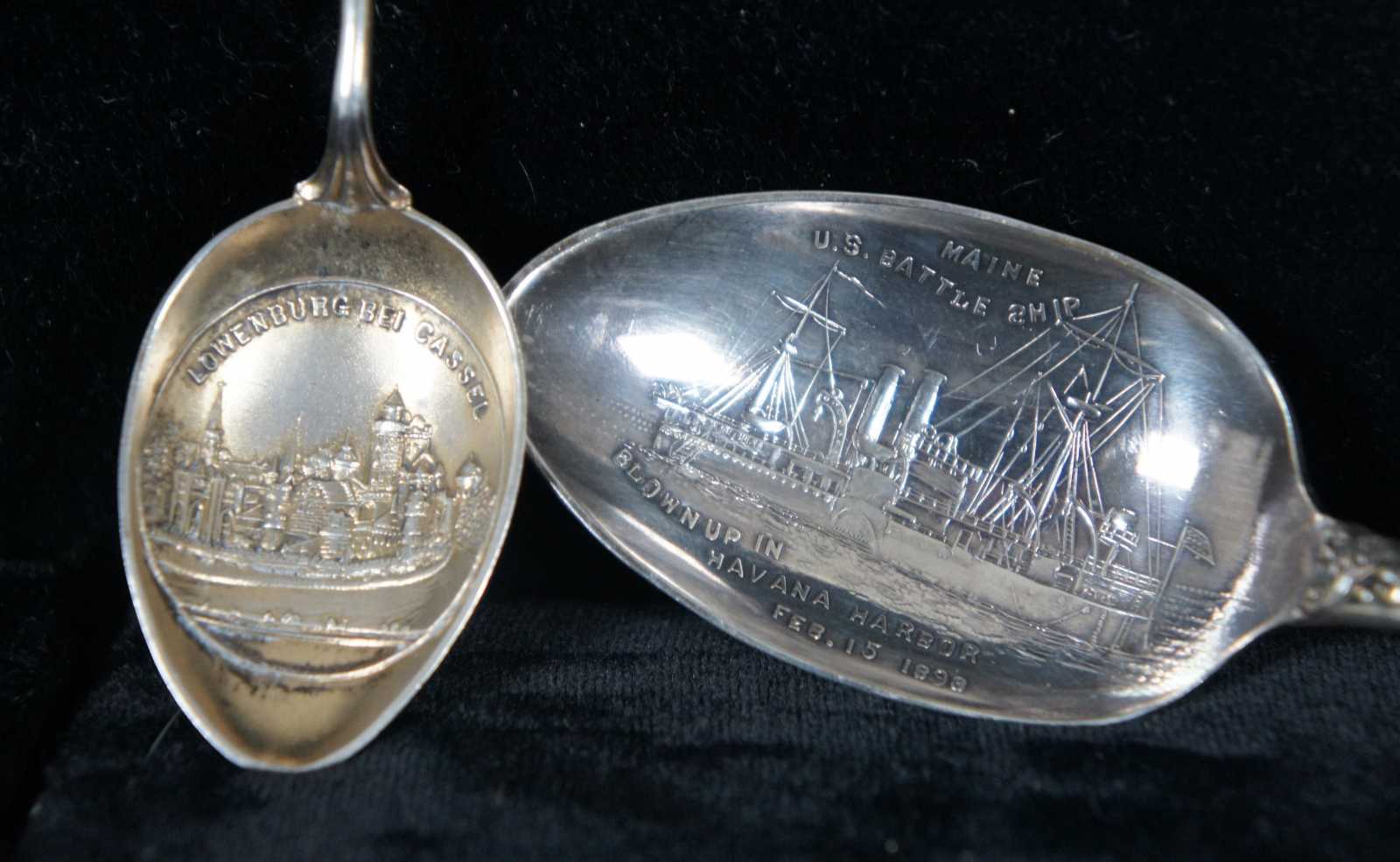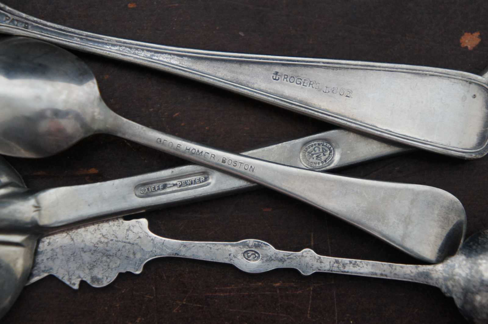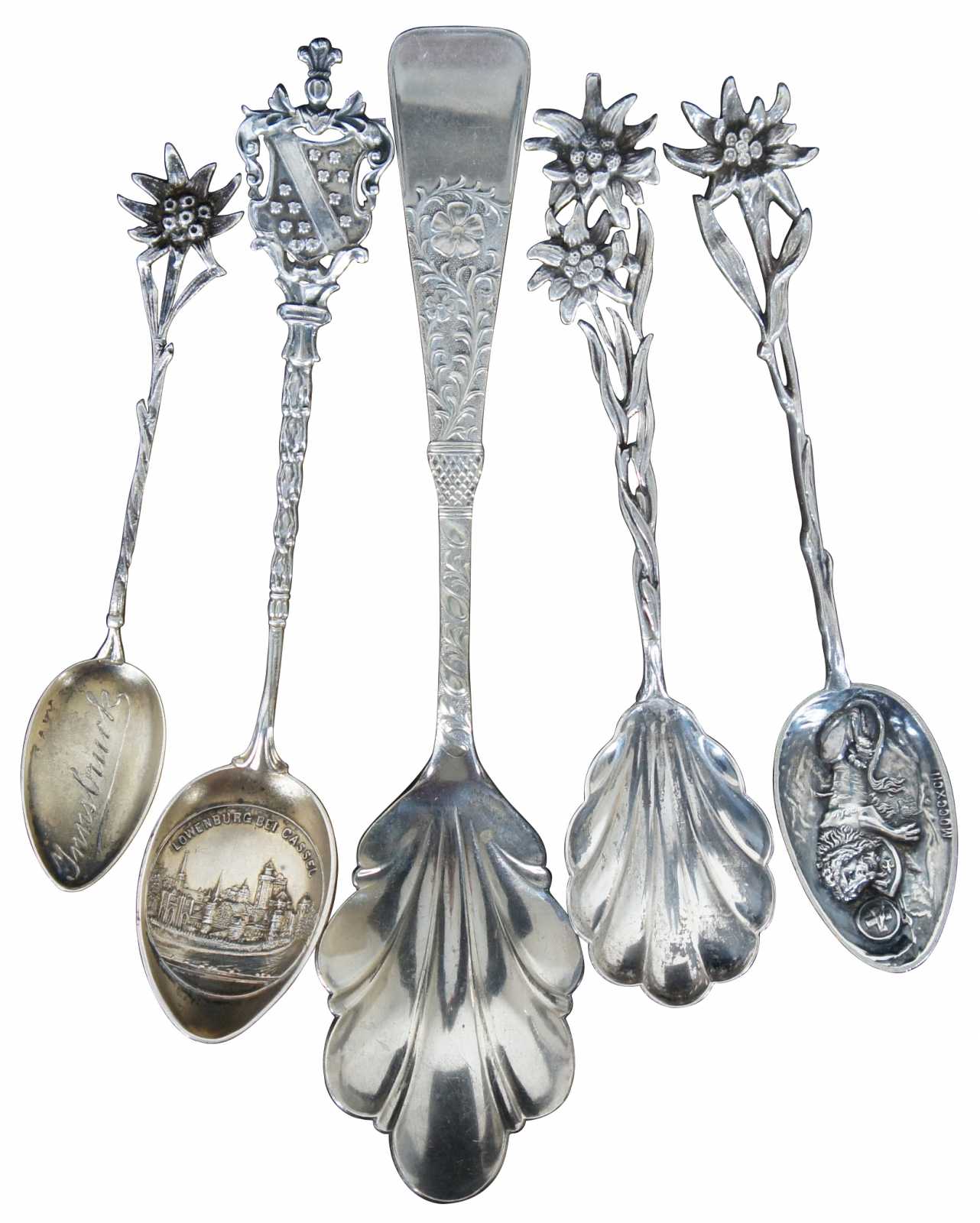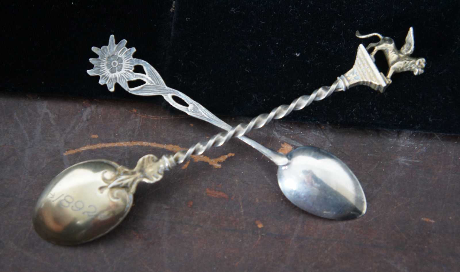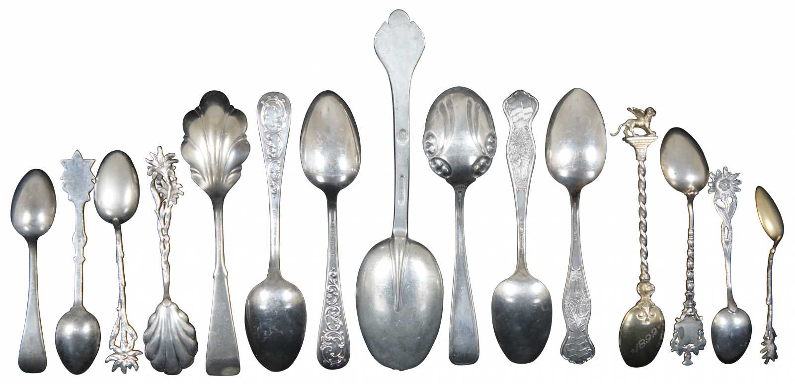 Lot of 15 vintage and antique silver plate and 800 sterling silver assorted souvenir, sugar and tea spoons.