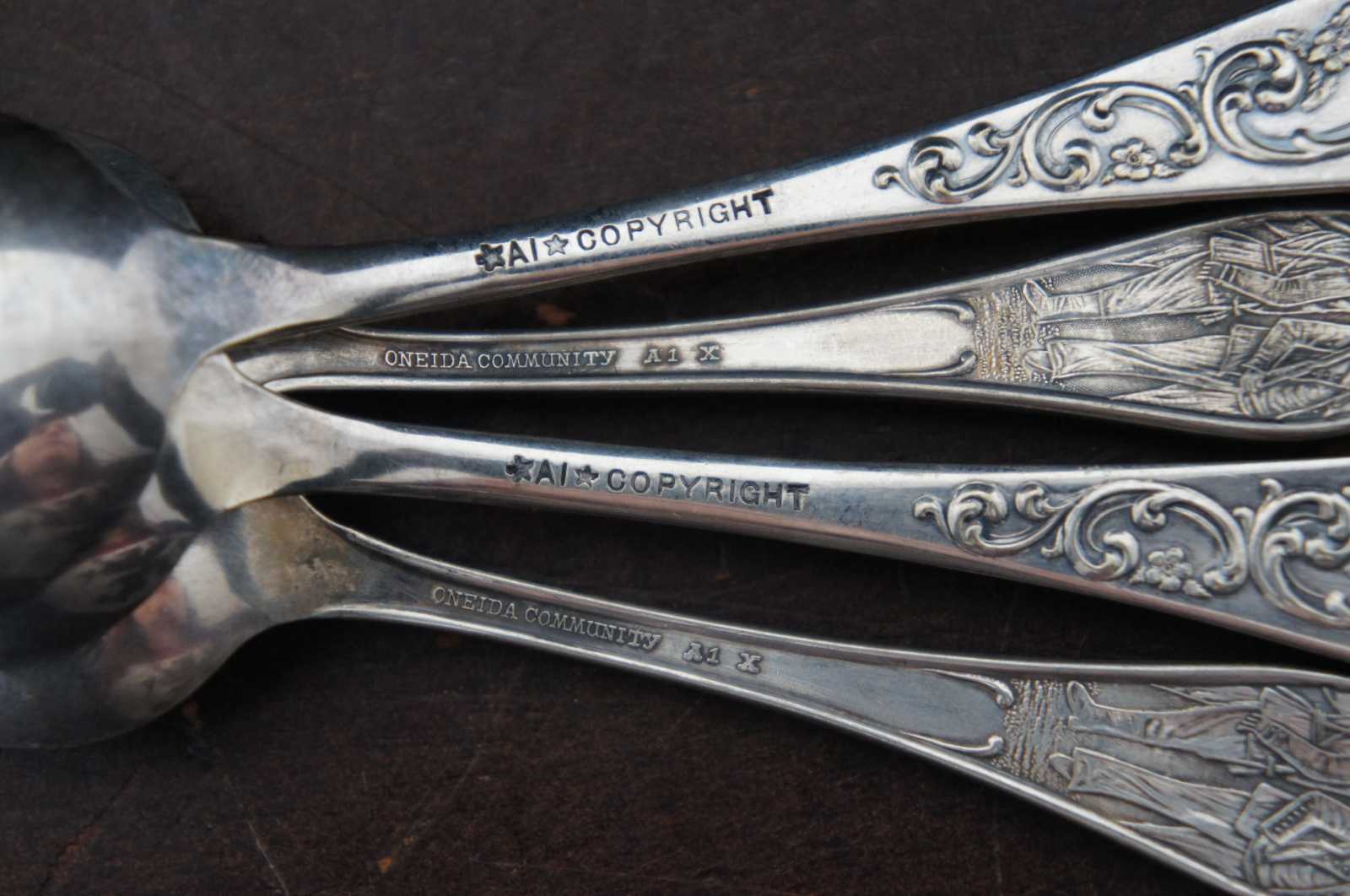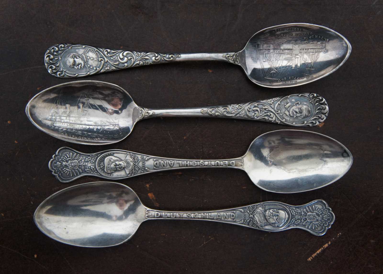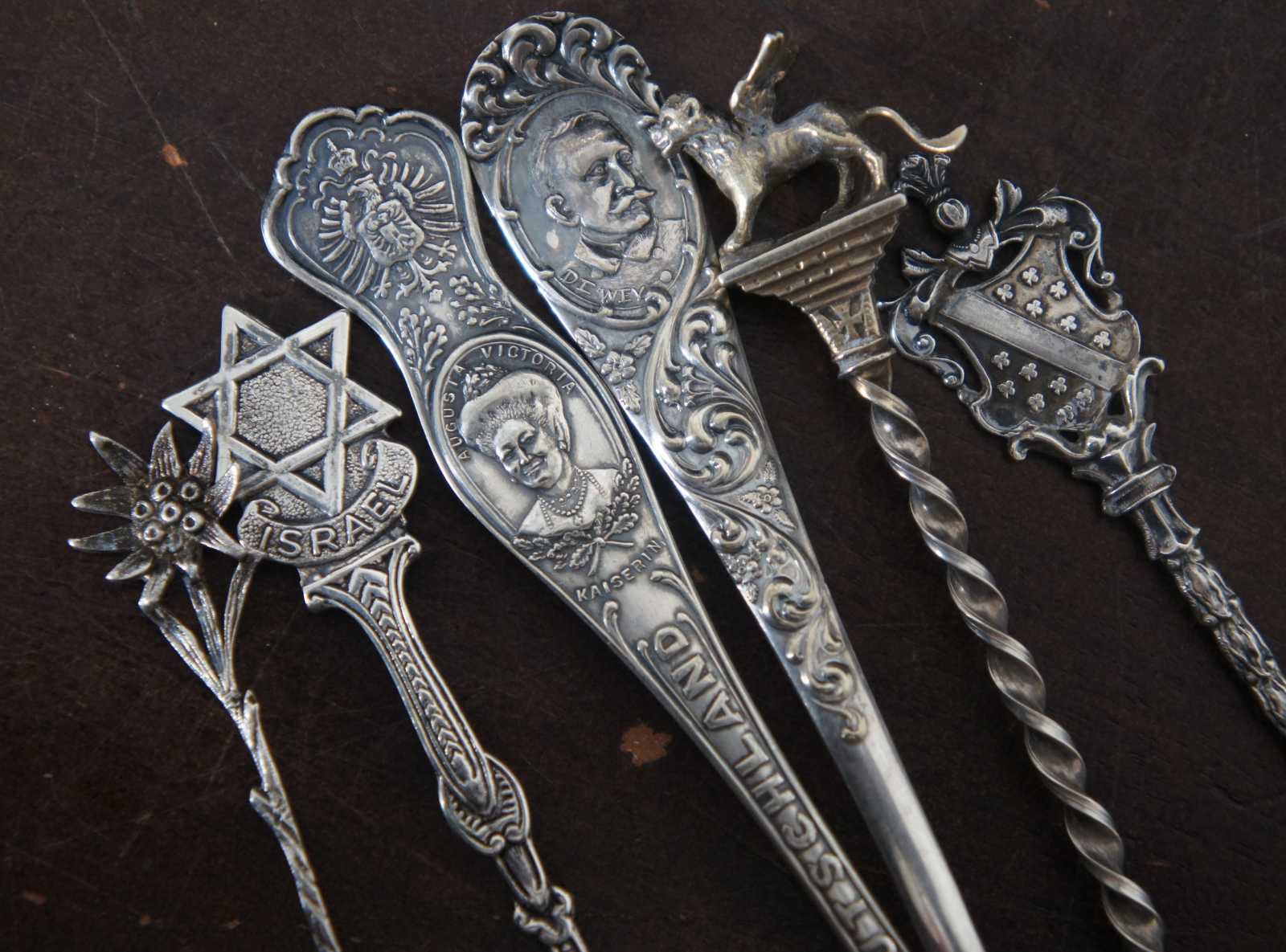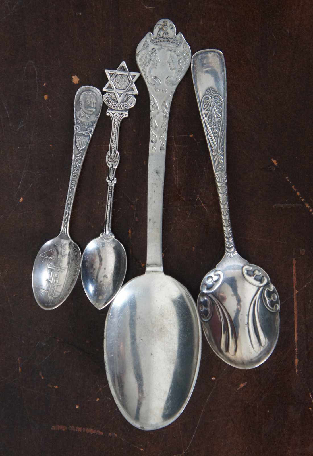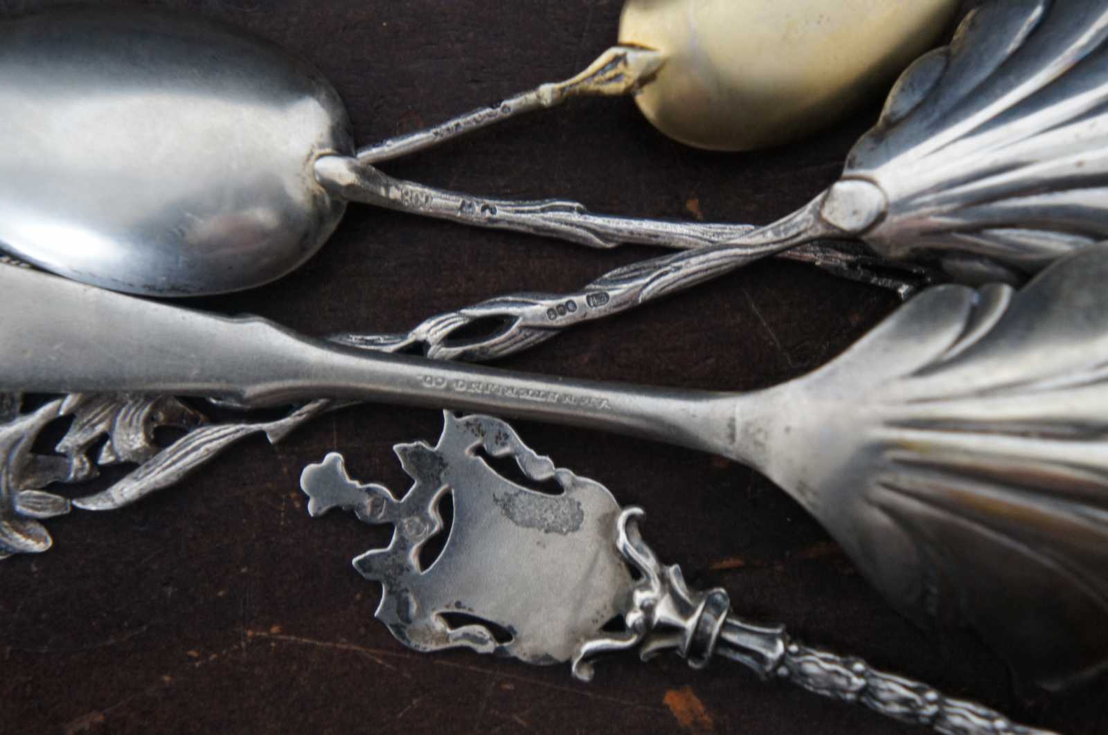 Lot of 15 vintage and antique silver plate and 800 sterling silver assorted souvenir, sugar and tea spoons.