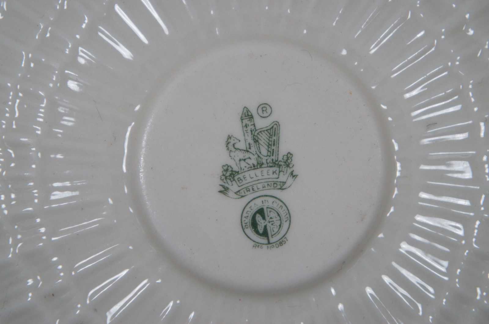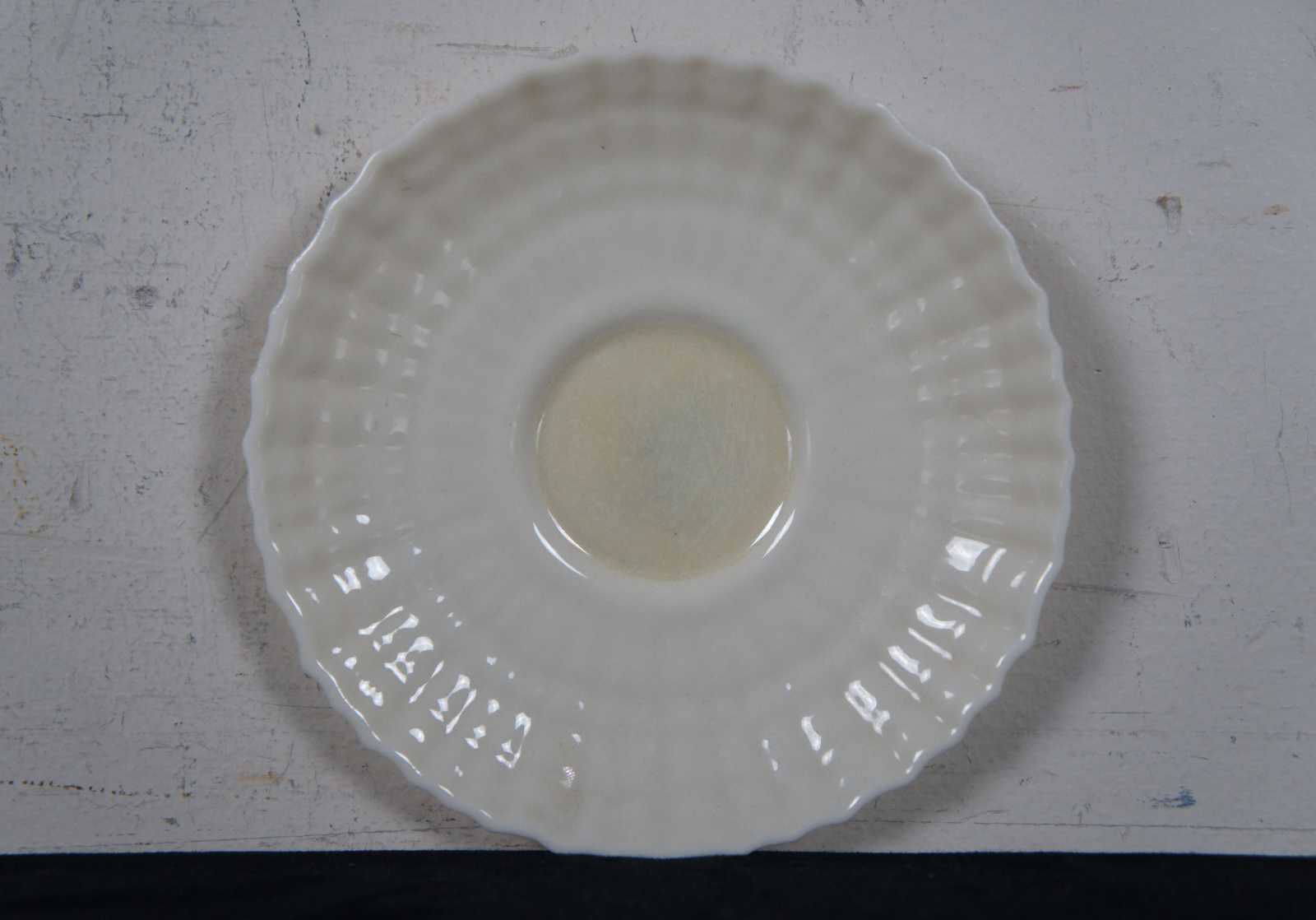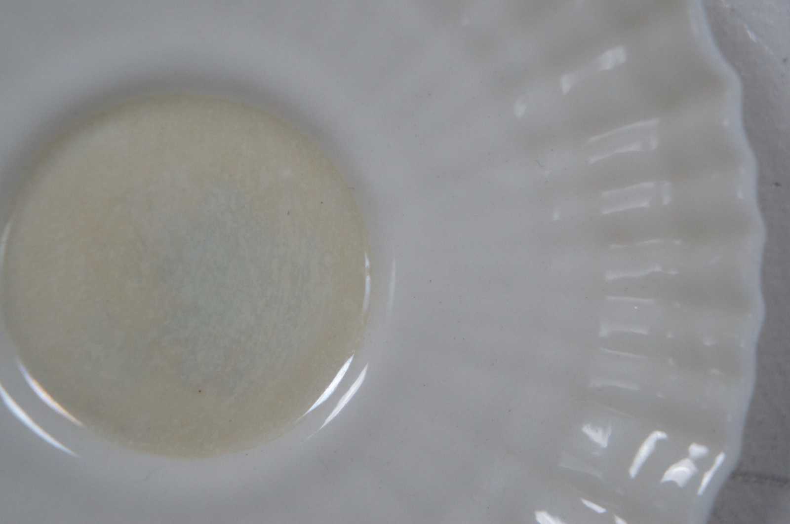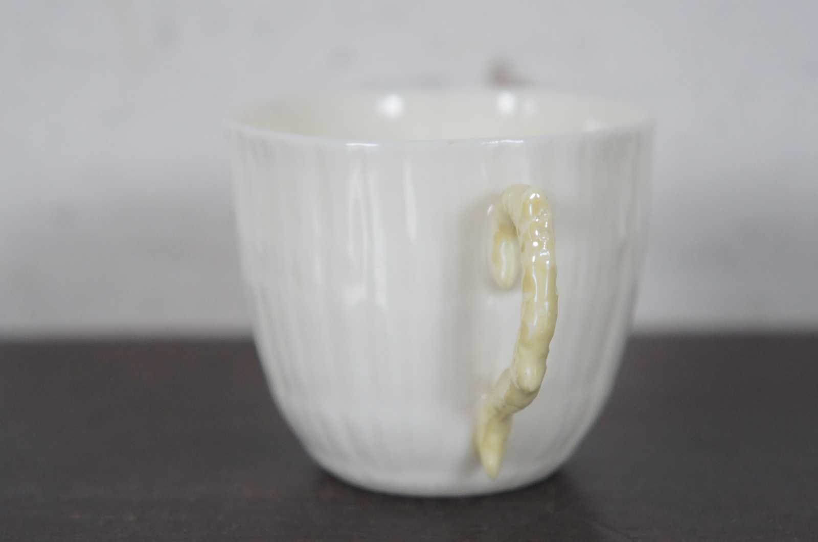 Antique Belleek Irish porcelain demitasse tea cup and saucer textured like a seashell with yellow accents.