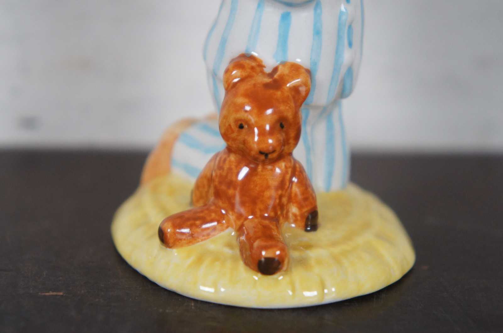 Vintage 1986 Royal Doulton Bunnykins figurine #DB55 Bedtime rabbit in blue stripe pajamas saying his prayers next to his teddy bear. Includes original box.
