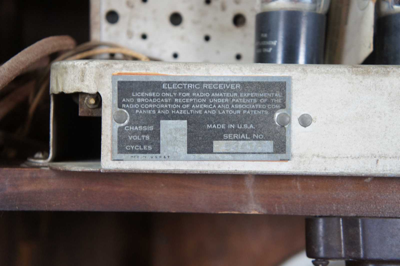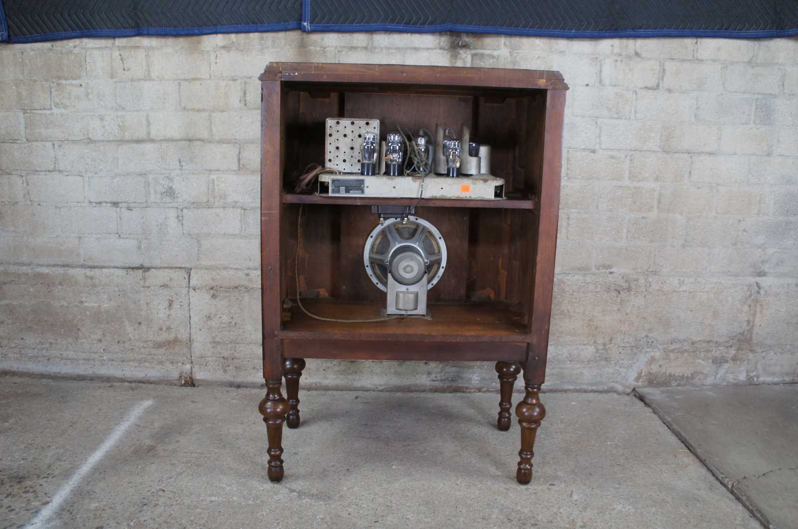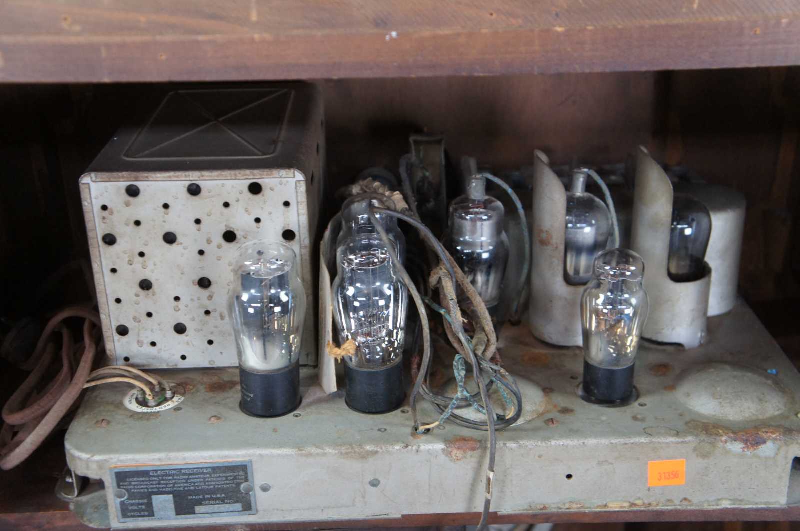 Fair condition, wear and distressing commensurate with age and use, finish loss along top, turns on but needs some adjustment, potentially a tube, buzzes when on, just no sound.
