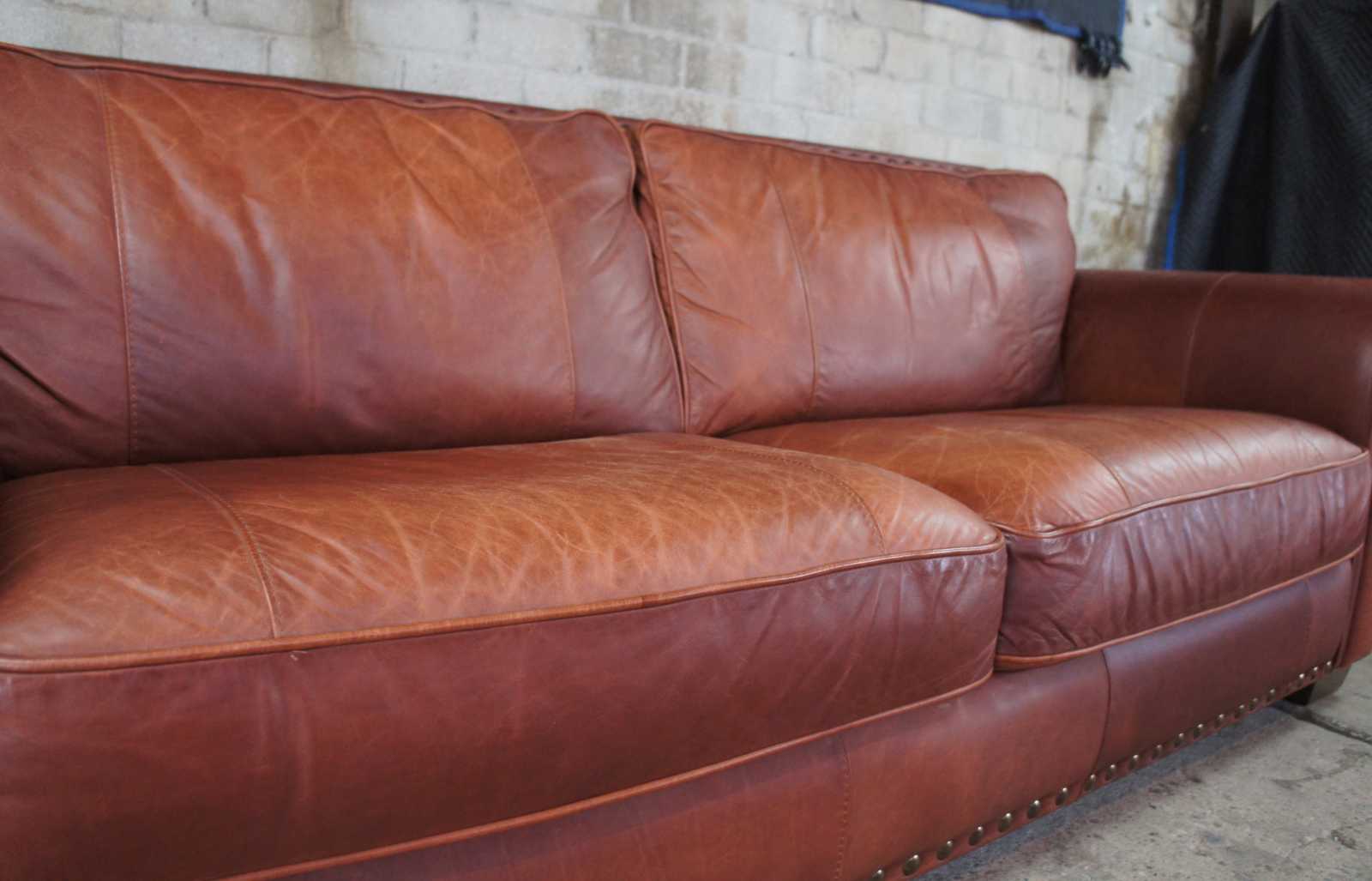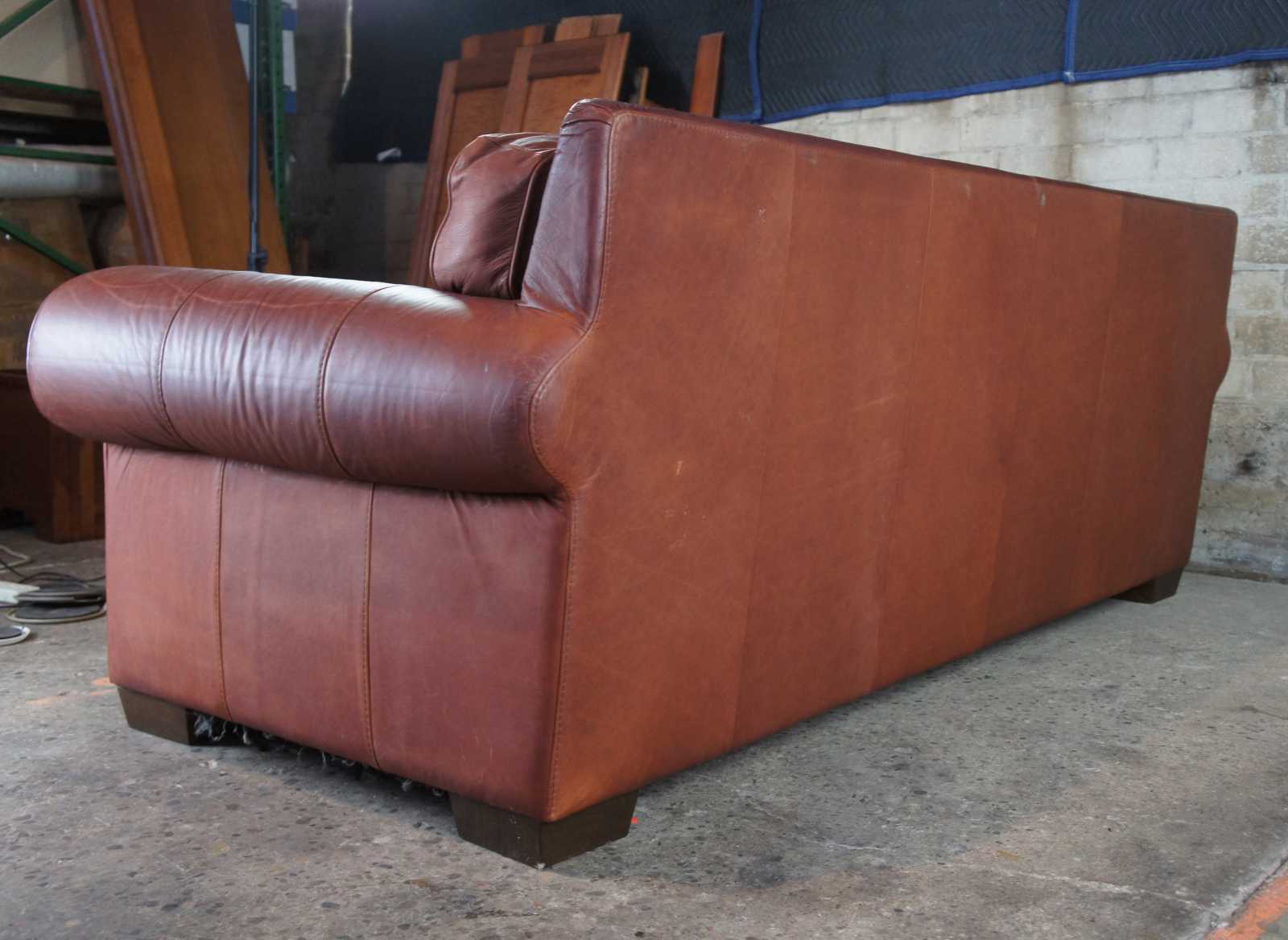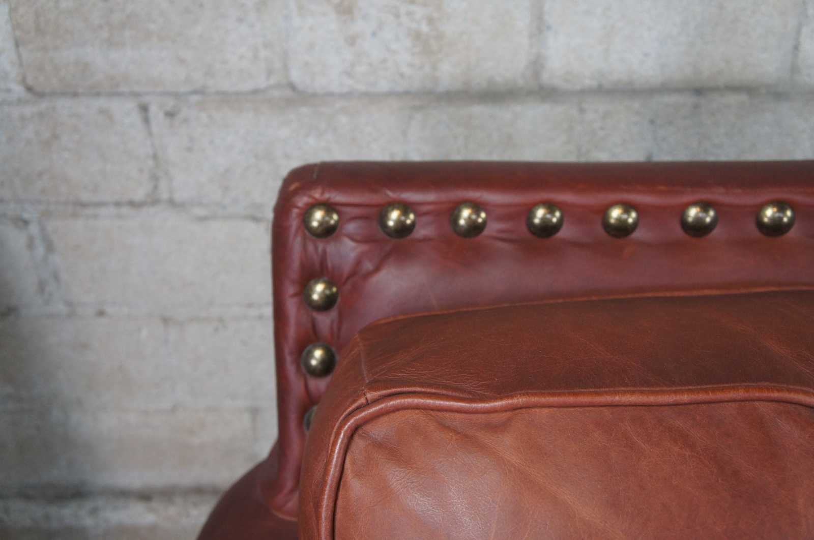 Vintage leather Monaco sofa featuring rolled arms, cognac leather and oversized nailhead trim. Made in Italy circa 2000.
