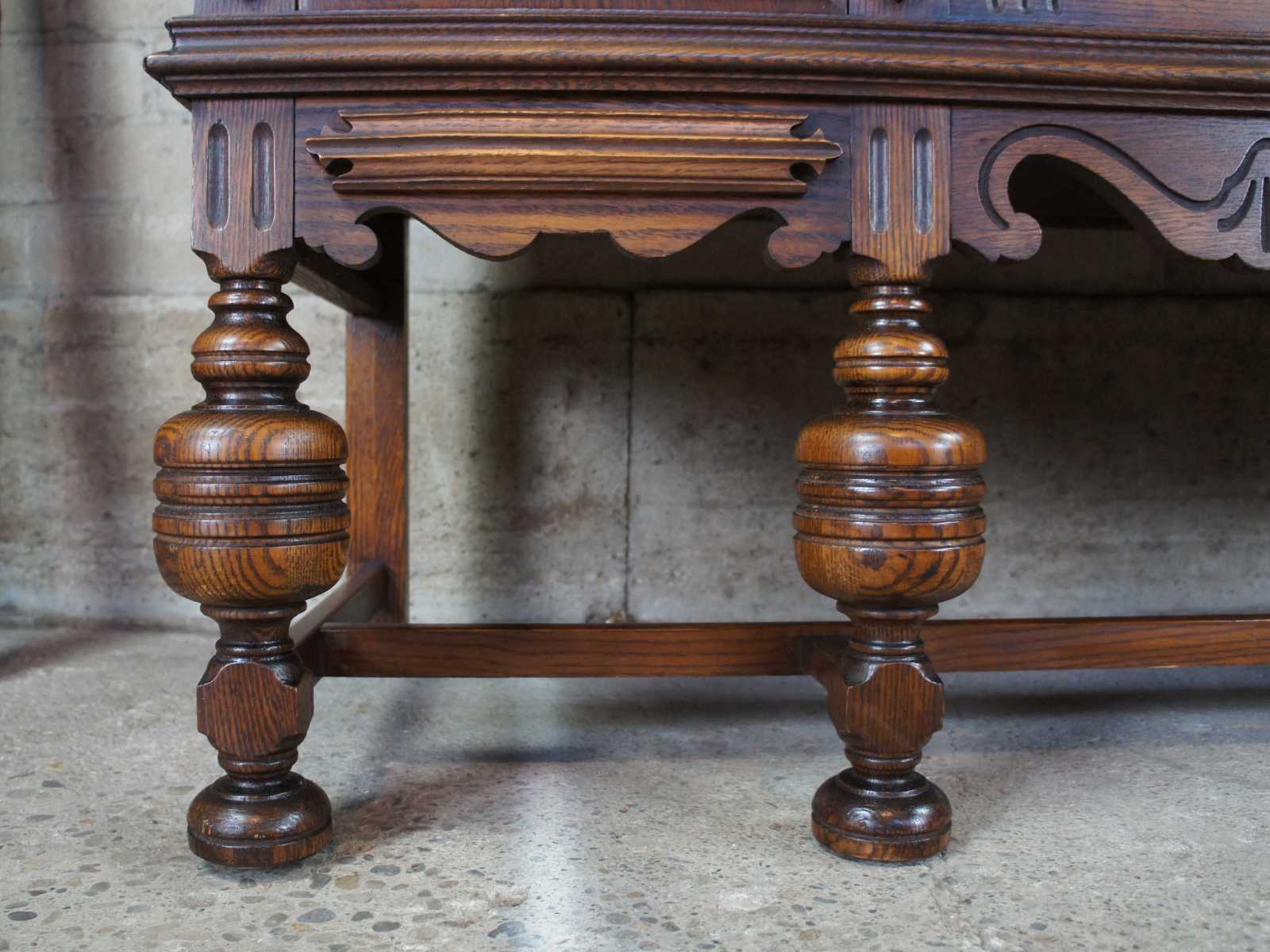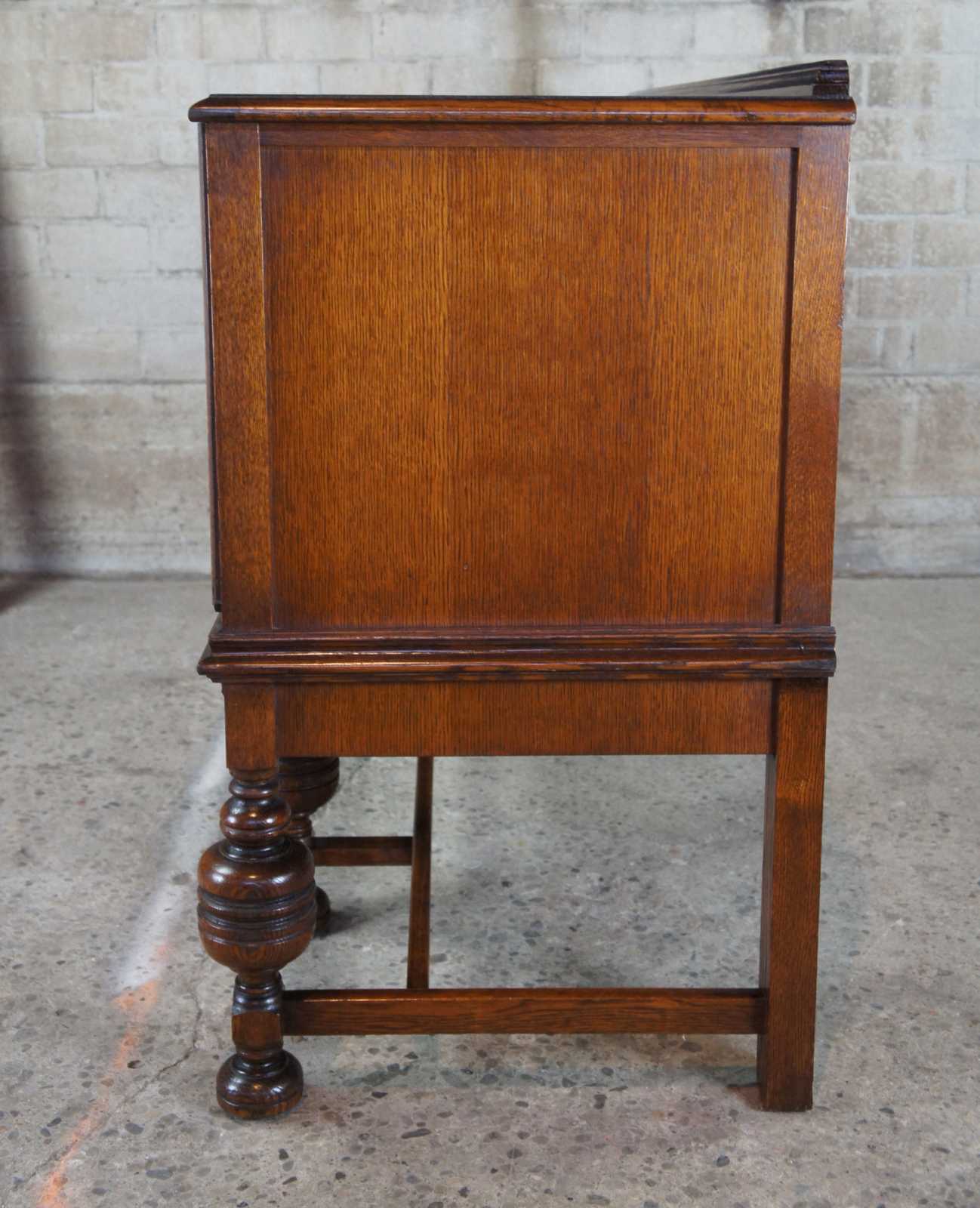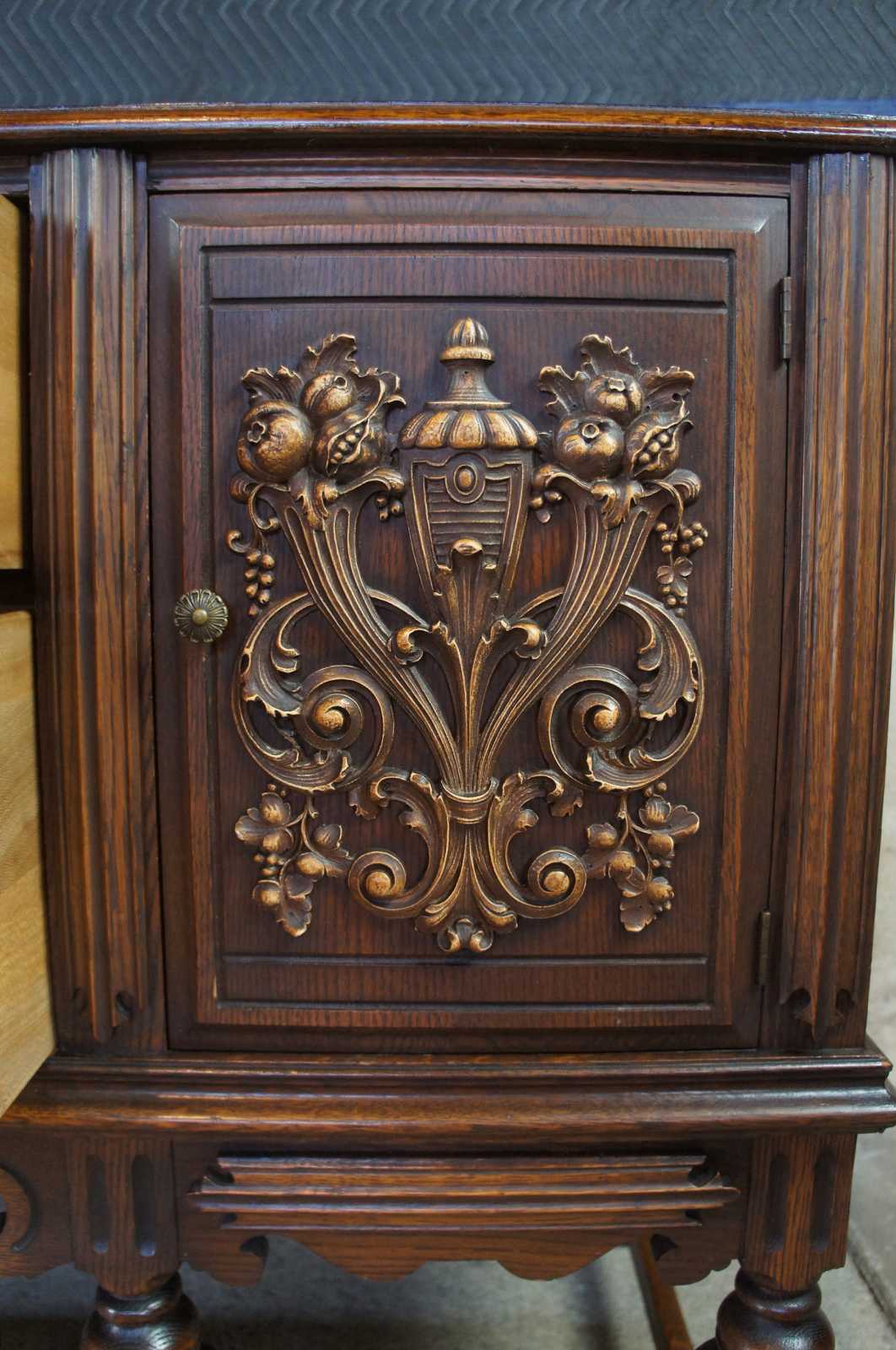 Early 20th Century Jacobean / Elizabethan revival buffet or server by Basic Furniture Company out of Waynesboro, Virginia. Made from oak with two drawers between two cabinets supported over carved serpentine apron over turned baluster supports and bun feet connected by stretchers. Carvings of a trophy urn with conocopias of fruit, nut and acanthus leaves.