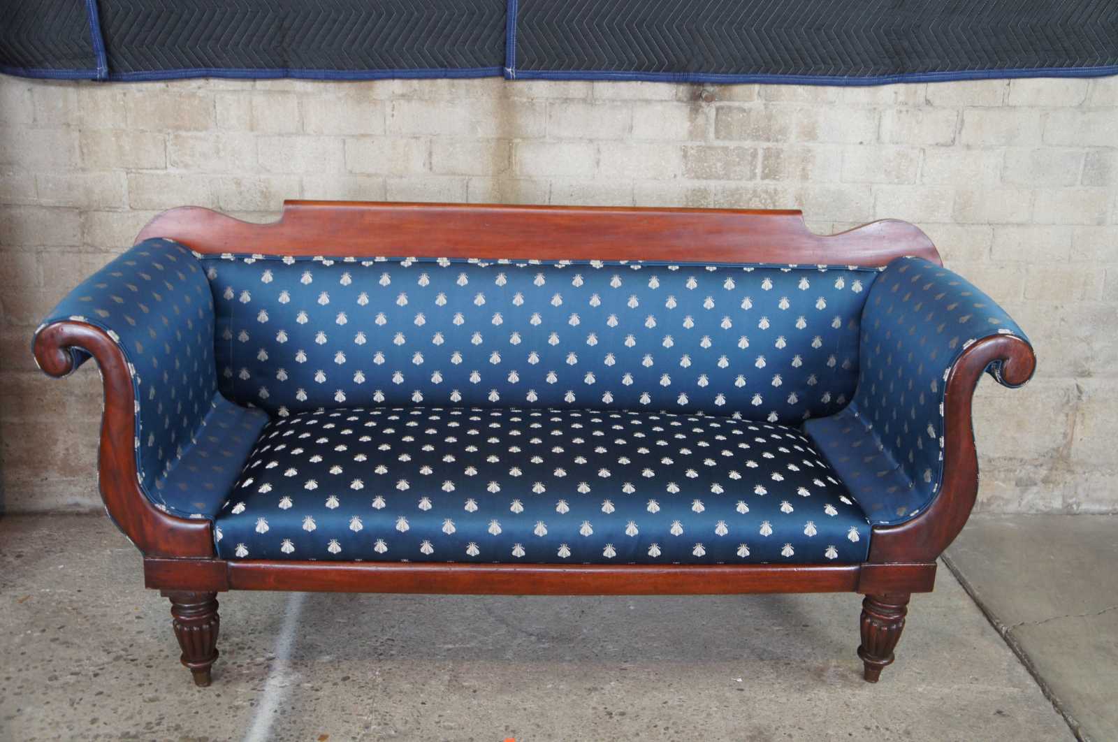 Antique Victorian parlor settee or sofa. Made of mahogany featuring rolled arms and blue silk scalamandre upholstery with insects and bolster pillows. The sofa is supported by turned reeded legs with brass caps.