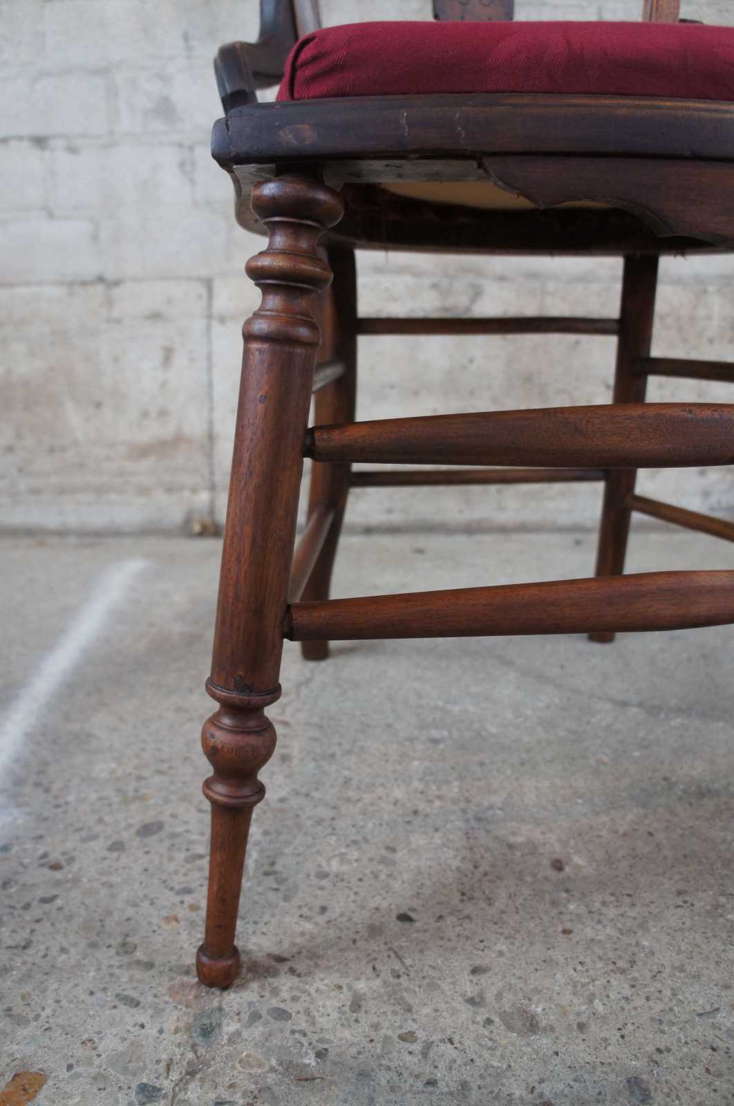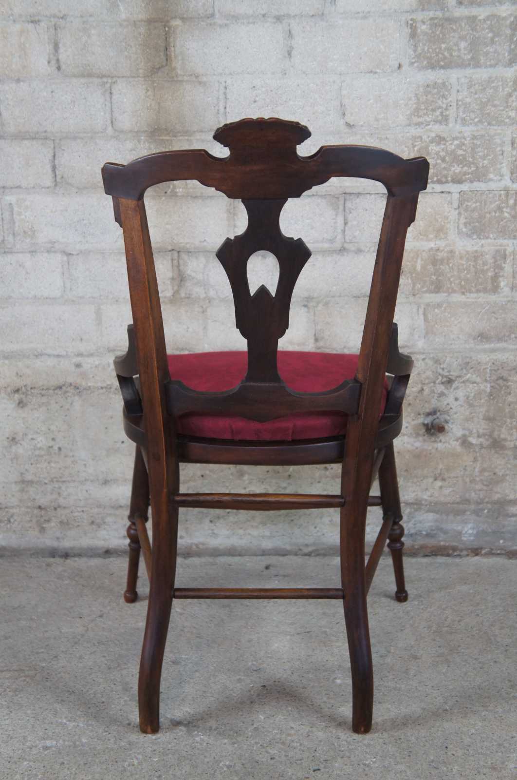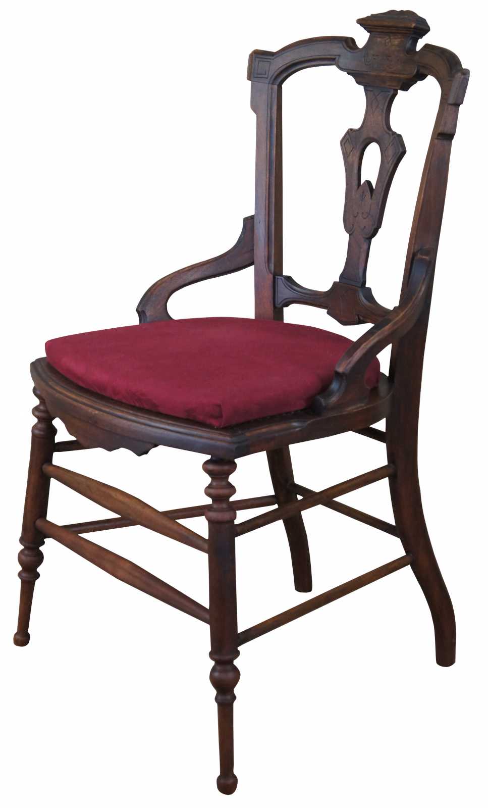 Antique Victorian Eastlake dining parlor chair. Made of walnut featuring ornate design with carved accents and turned legs.