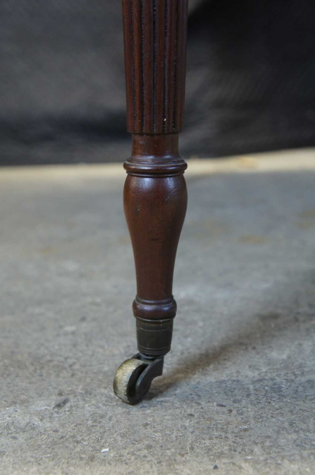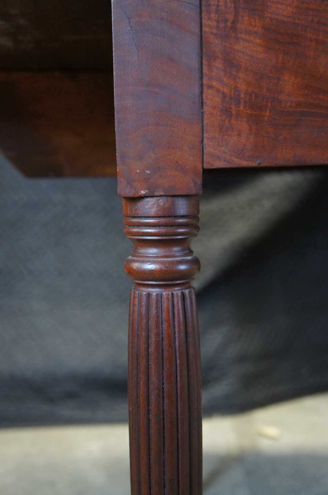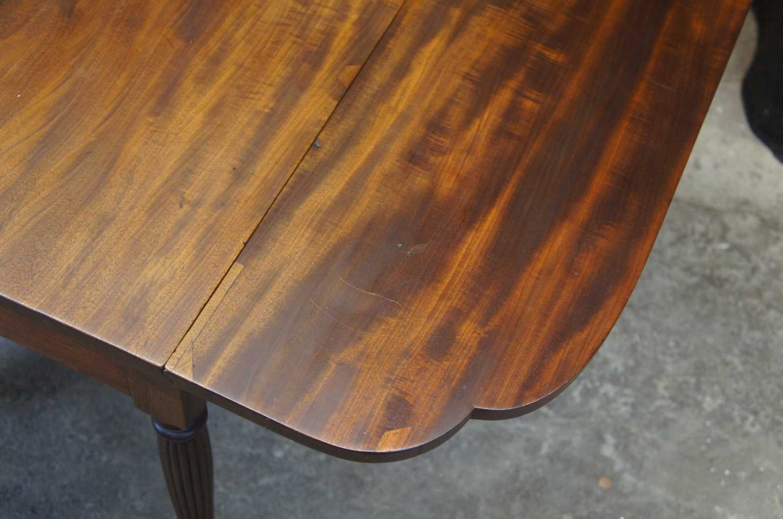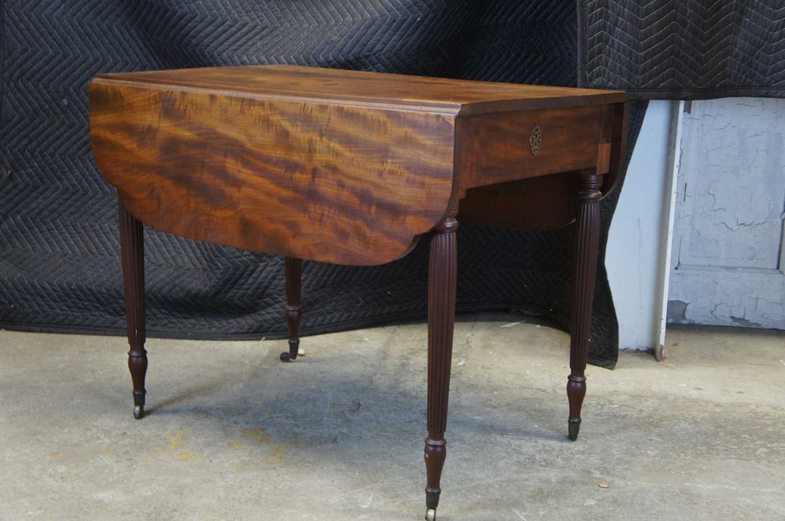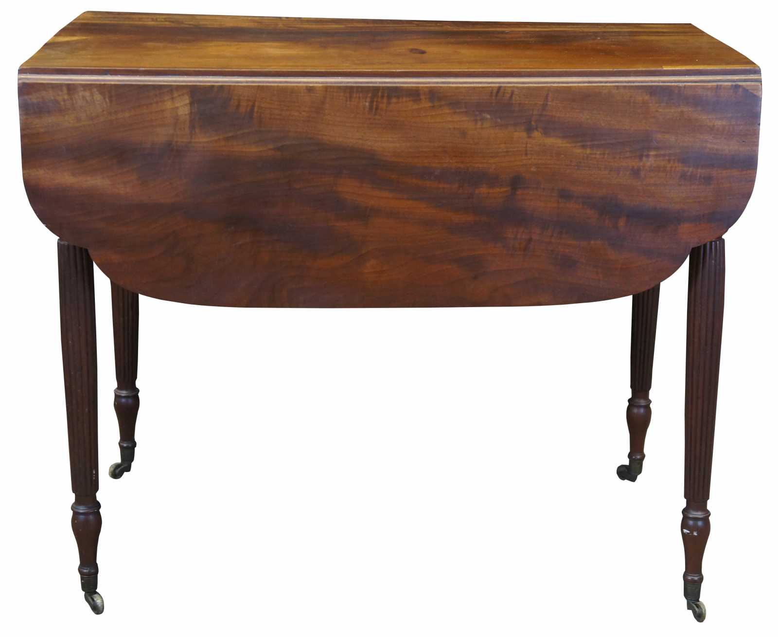 Early 19th century Federal drop leaf dining table. Made from mahogany with a rectangular form featuring shaped corners over turned and reeded legs leading to arrow feet with casters