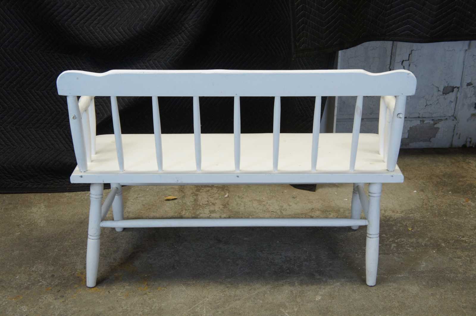 Primitive antique windsor style bench. Made from pine with spindled arms and back. Great for use on a patio or inside.