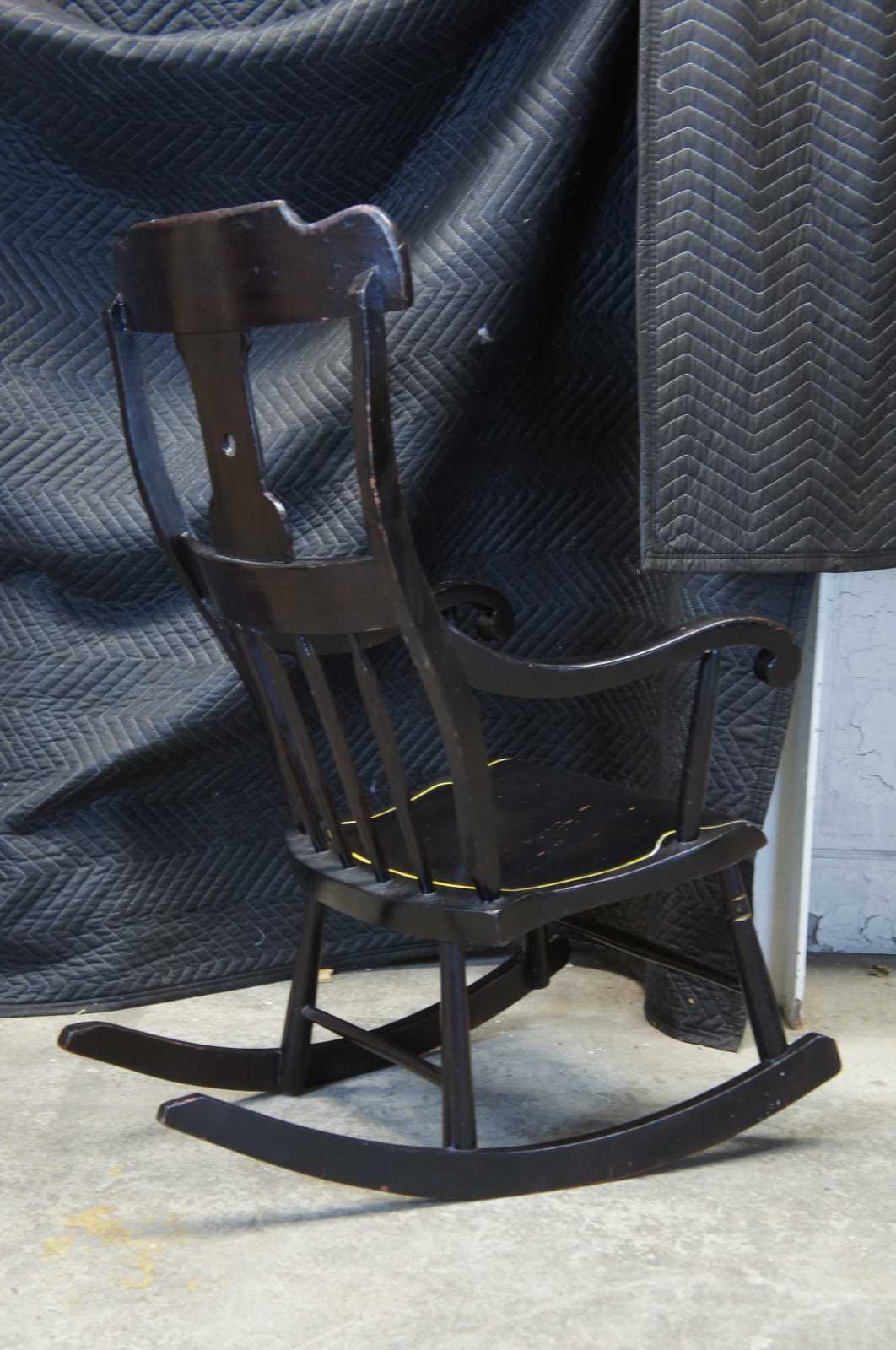 Antique 19th century Boston rocker. Features a black painted finish with hand stencilled fruit and flower deisgns. Includes a contoured rail over a pierced splat and lower rail over spindles leading to scrolled arms and a shaped seat.