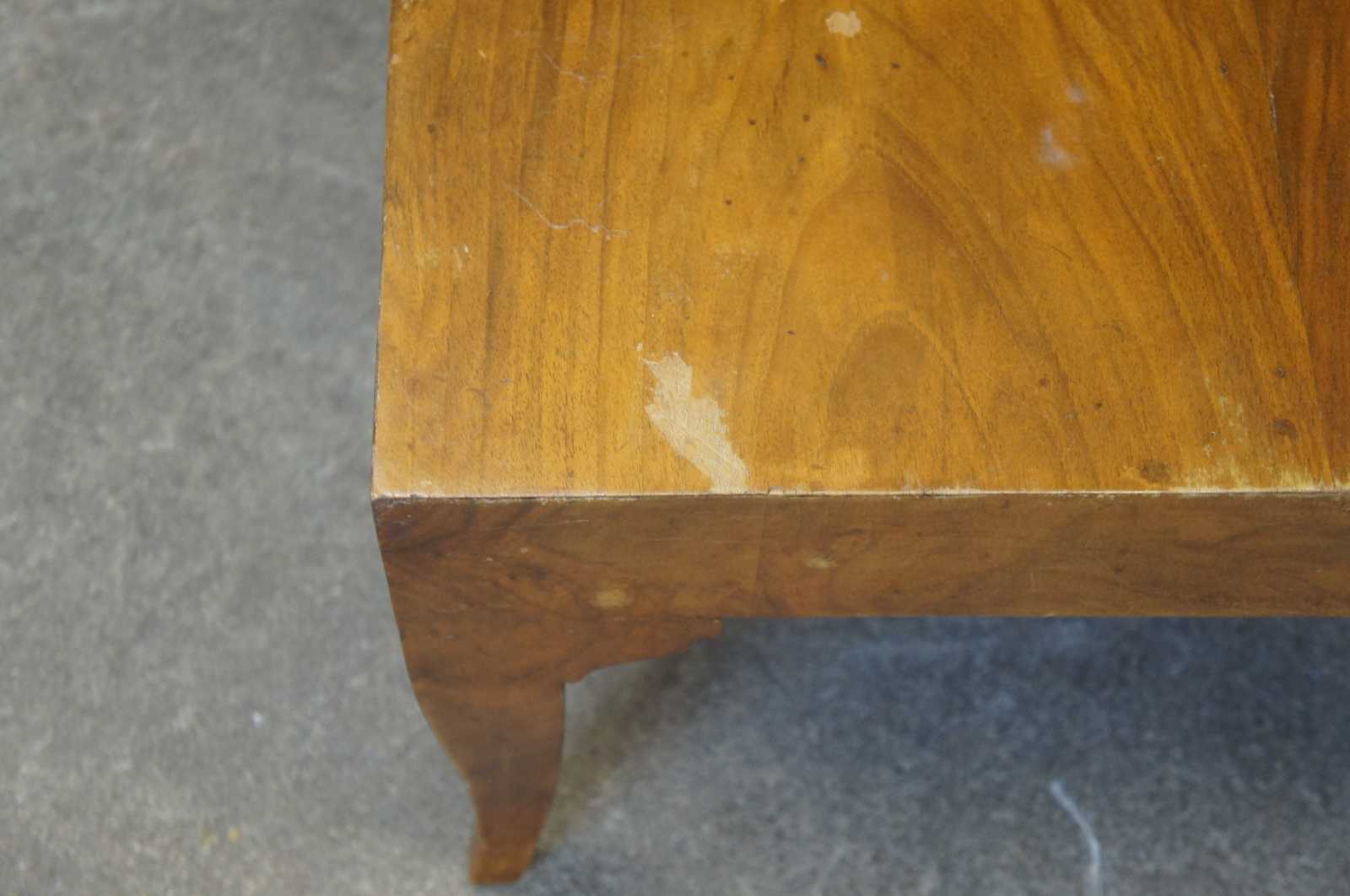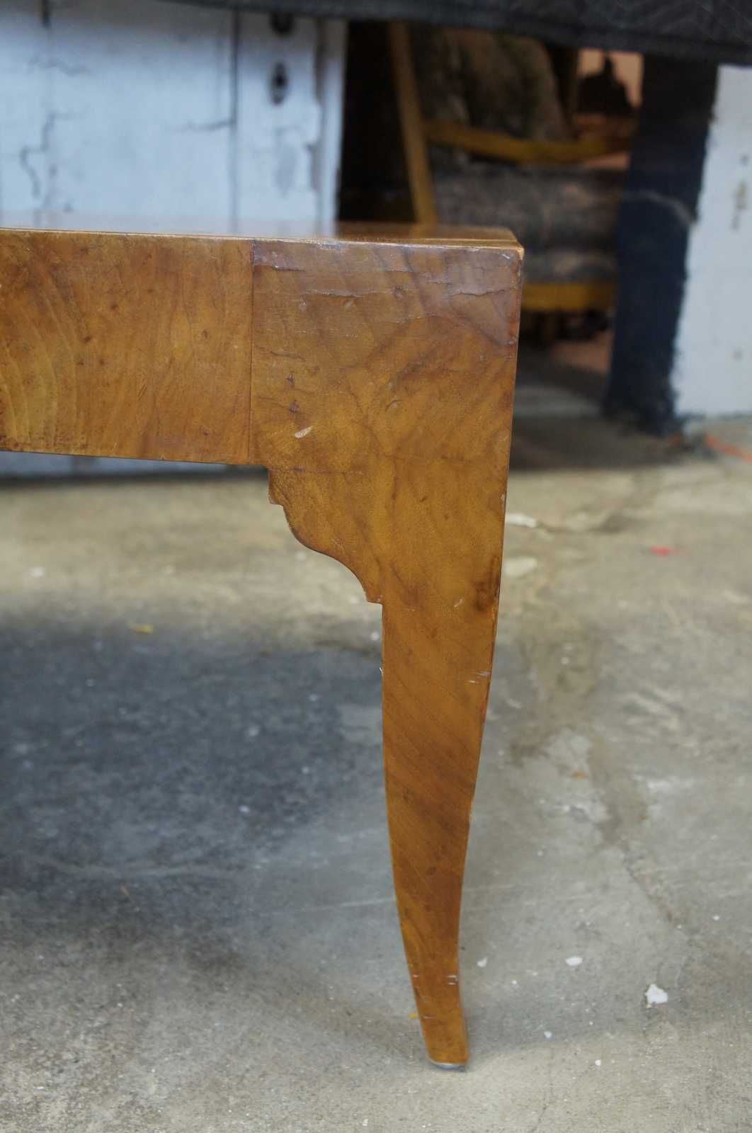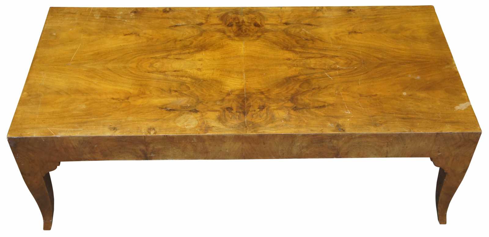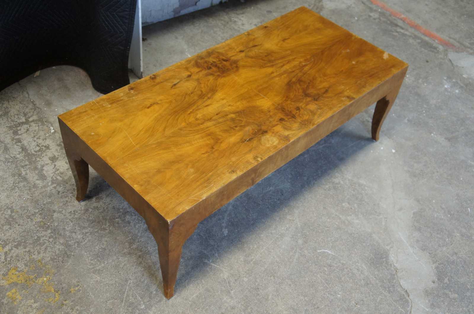 Mid Century Italian coffee table featuring burled walnut and flared tapered legs. Marked Italy 2399 on base.