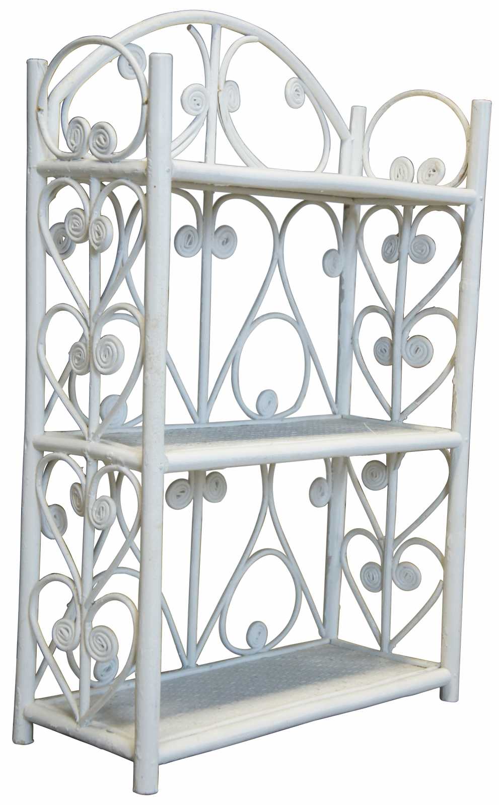 Vintage wicker and rattan etagere shelf. Features 3 tiers and a heart shaped open design. Can be hung by the top support as a wall shelf or used on a table/ floor surface.