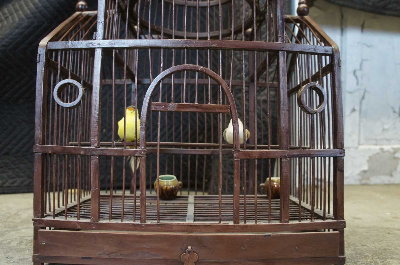 Victorian revival bird cage featuring a domed top, circular windows and turned finials. Includes two faux birds and two ceramic feeder bowls.