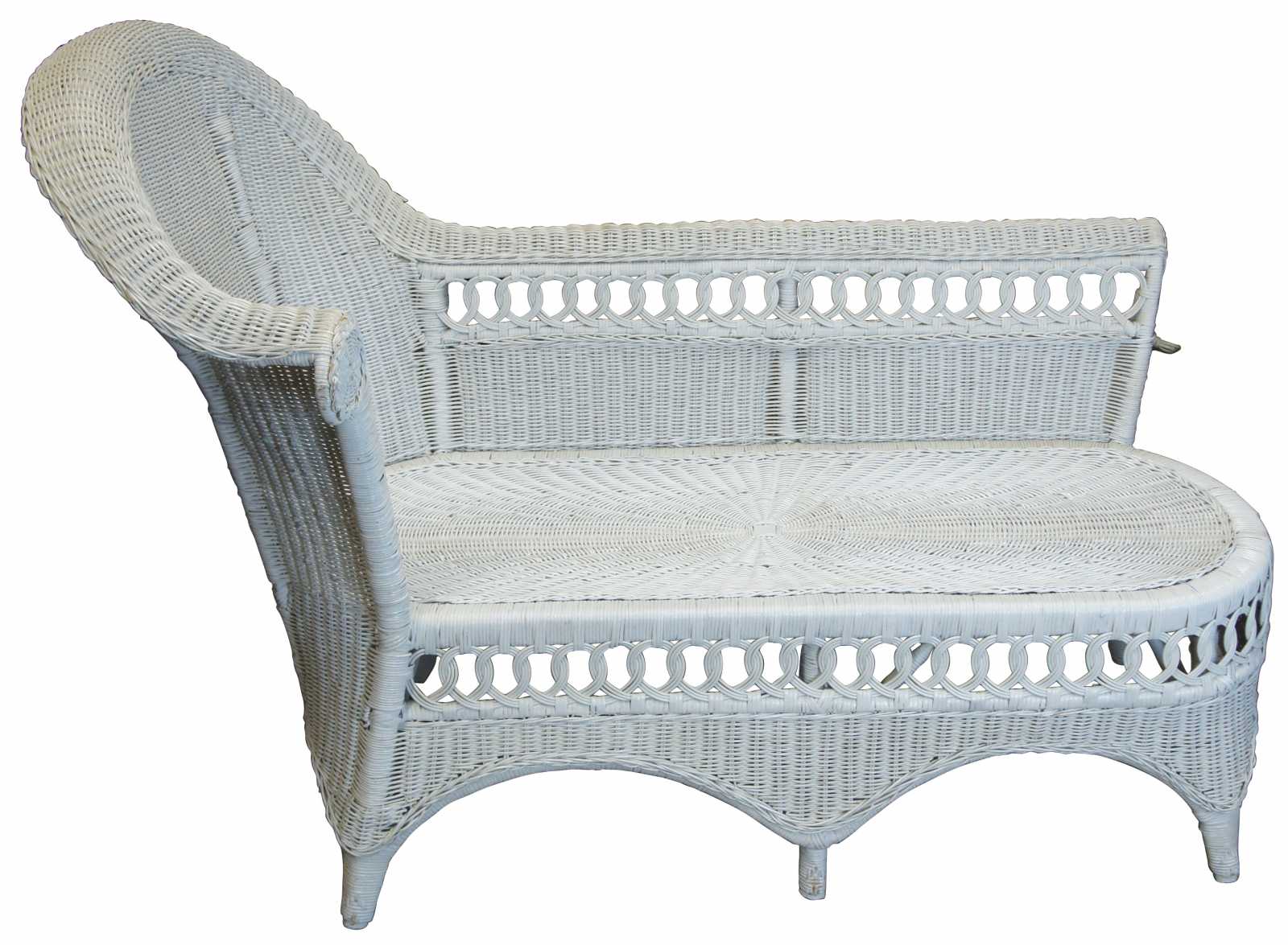 Vintage bamboo, wicker and rattan settee or lounge chair featuring a long rolled arm with circular braided wheel accent and interlocking rattan loop design.