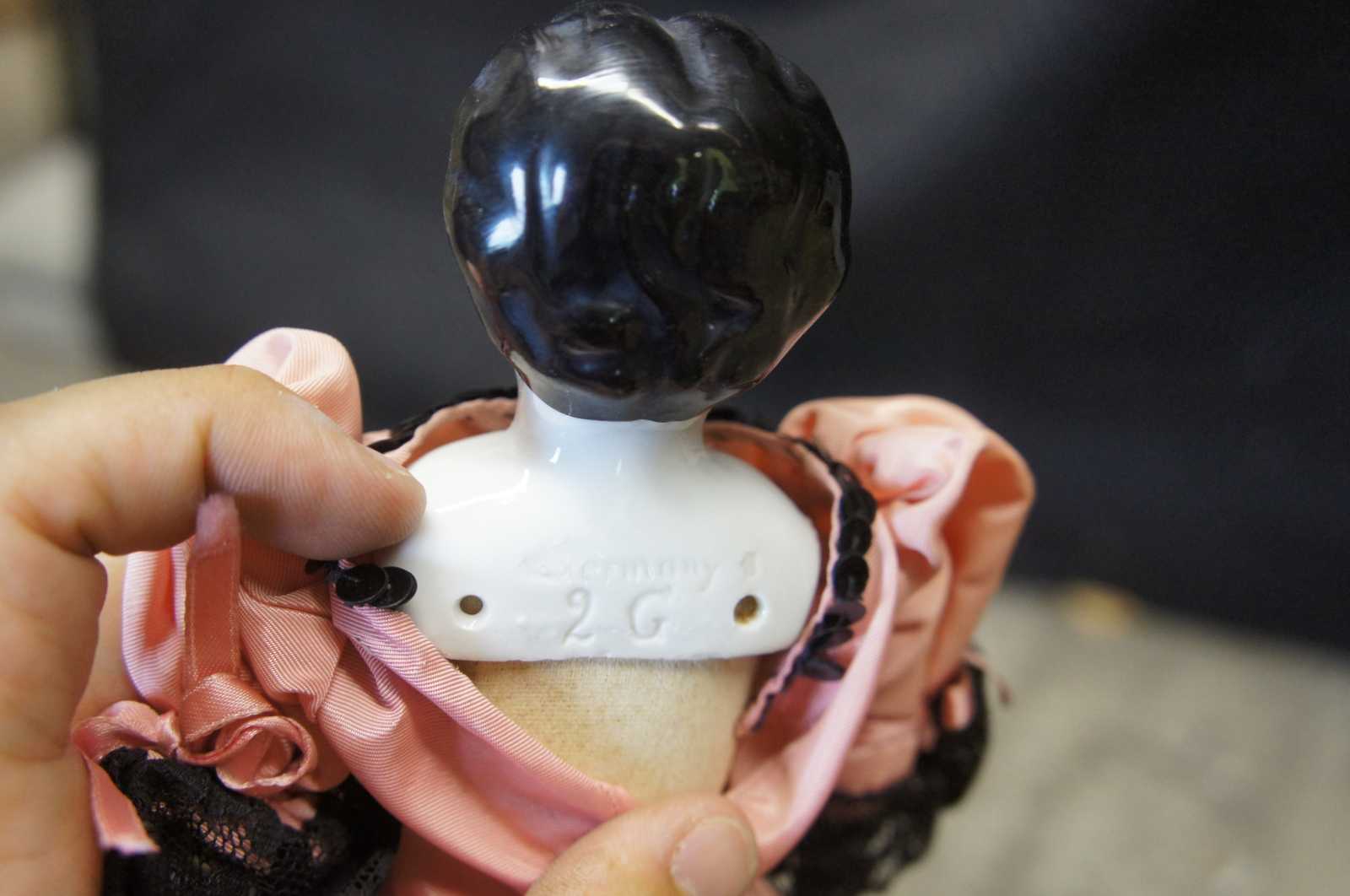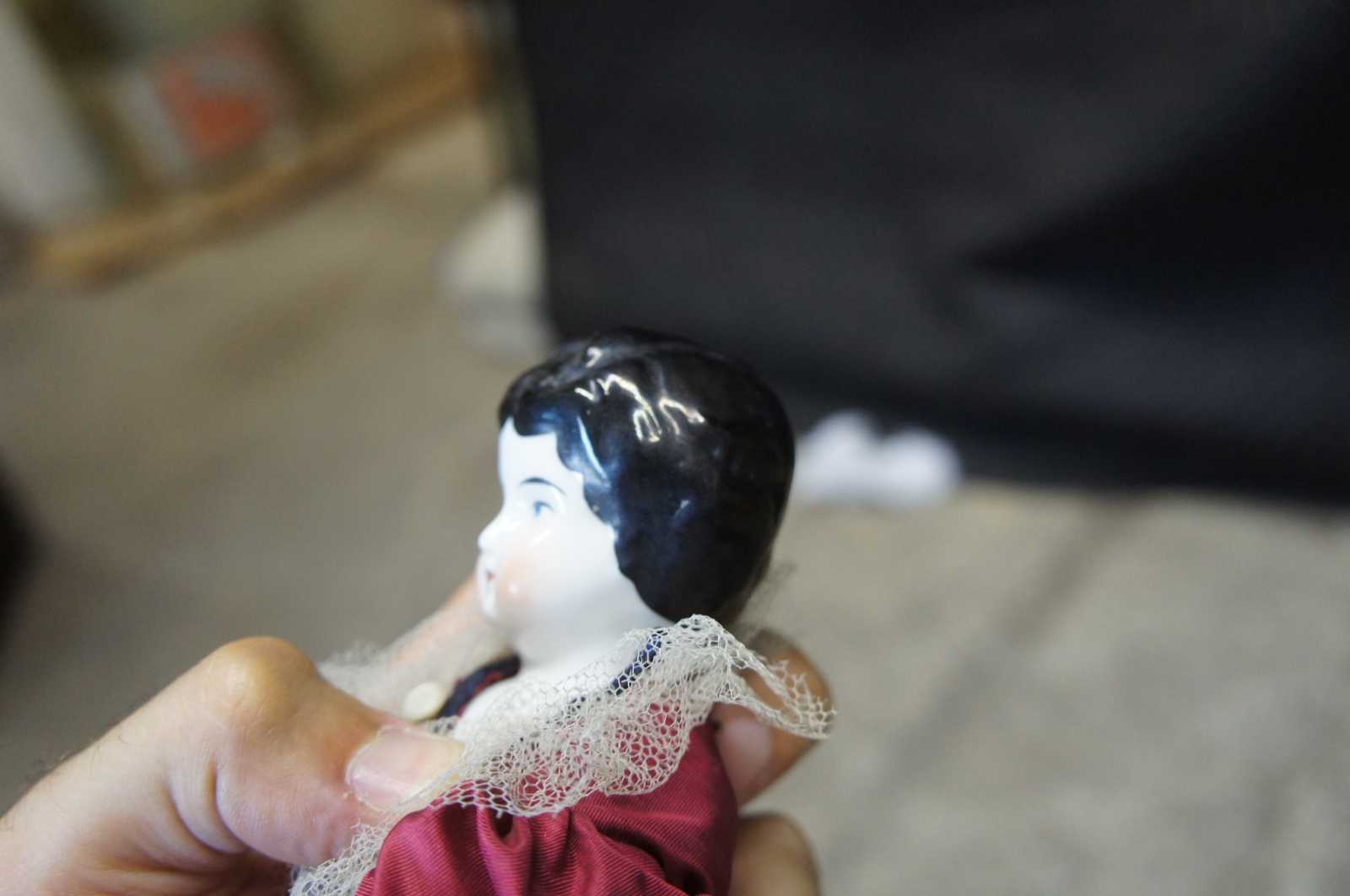 A pair of early 1900s Hertwig china head dolls. Made from Porcelain with marked back plates. Features classic attire, bisque limbs and cloth body.
