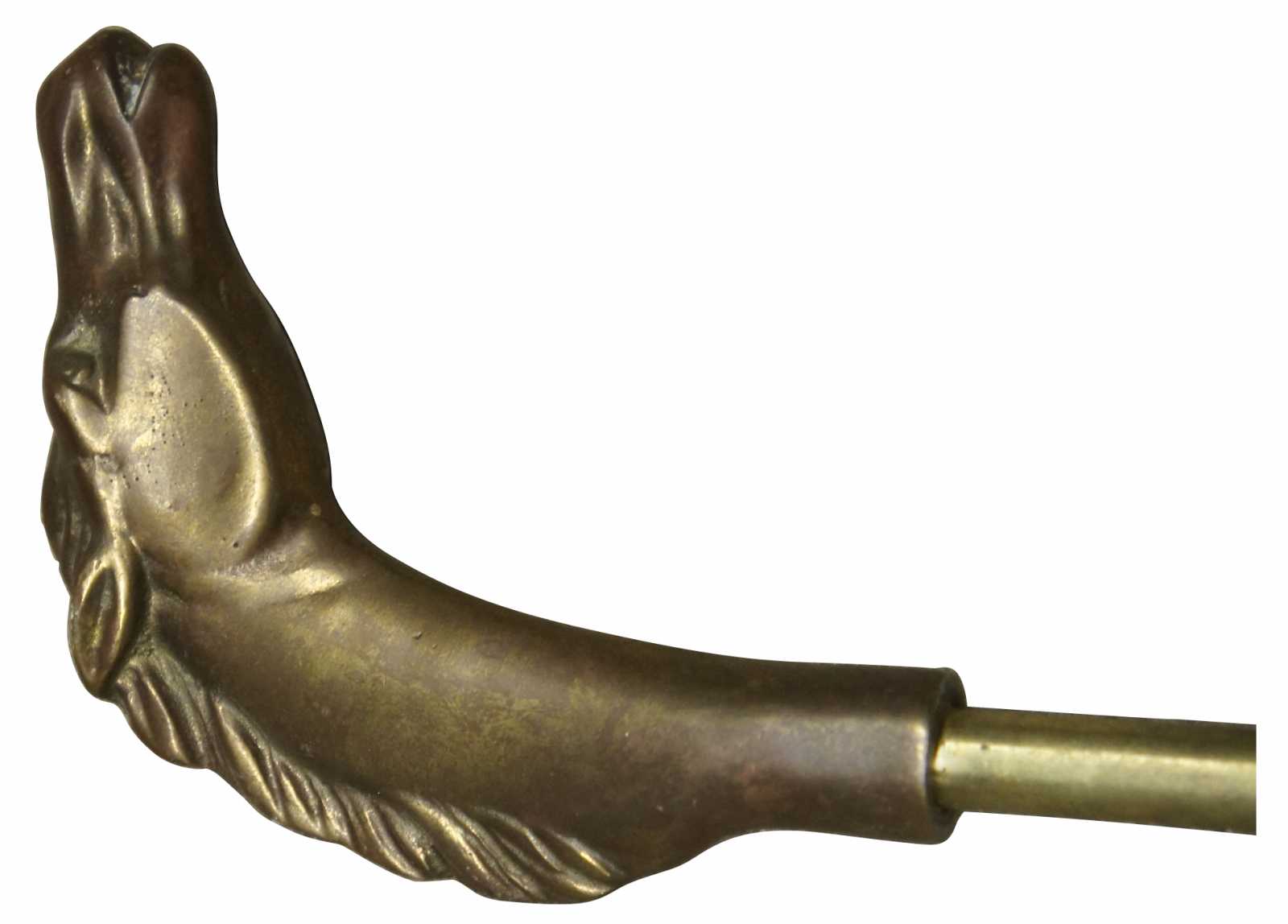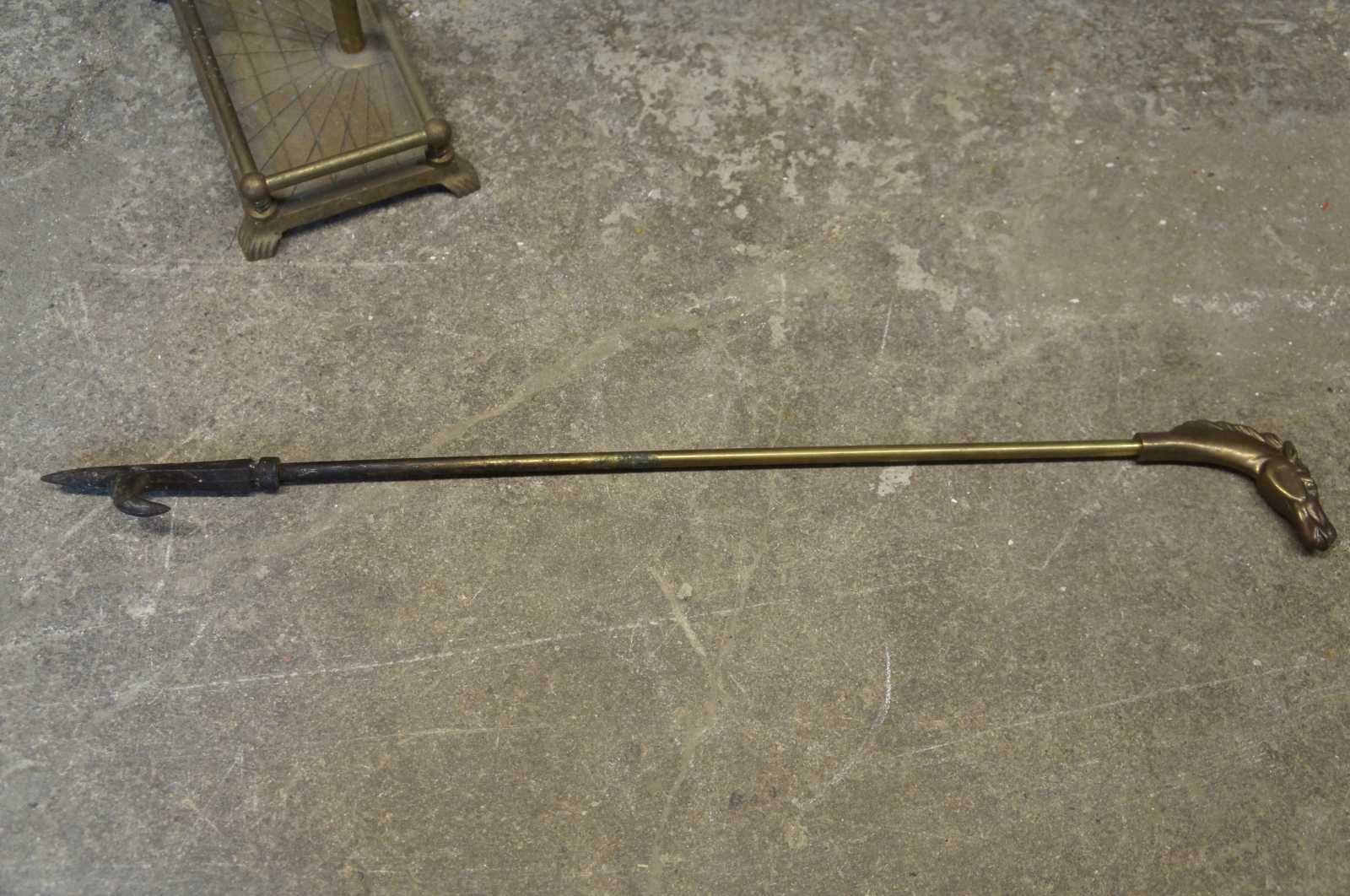 Vintage brass equestrian horse motif fire tools. Features sweeper, poker, tongs, shovel and stand.