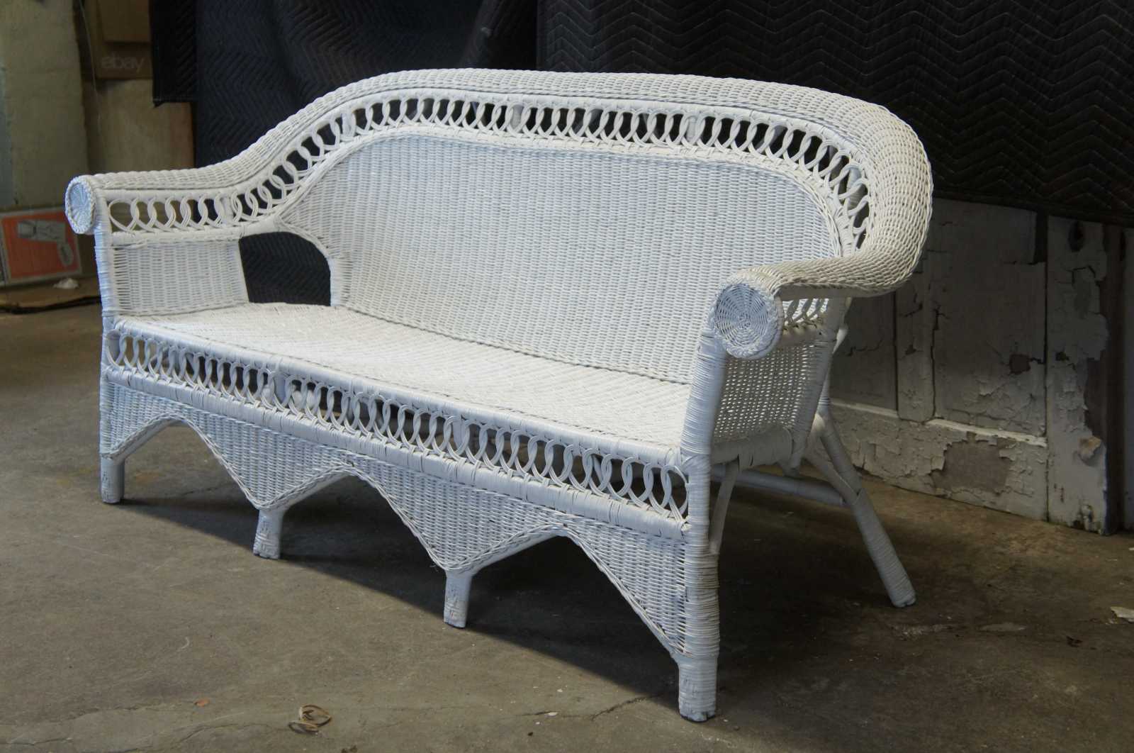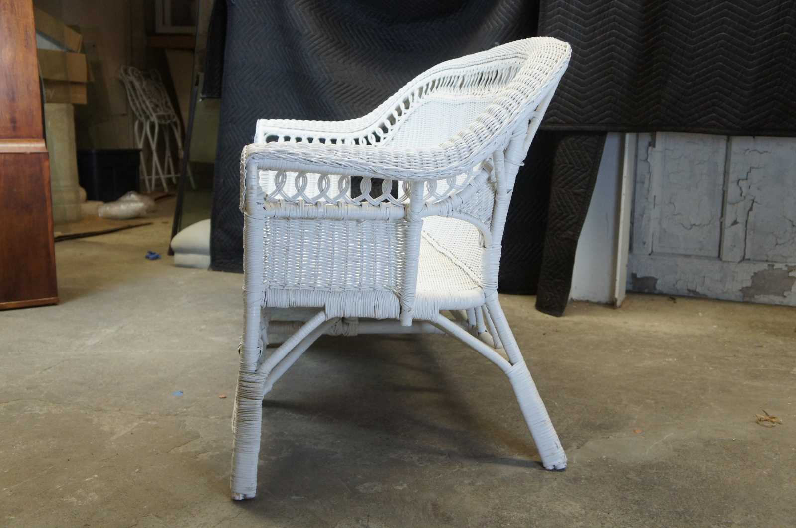 Circa 1940s wicker sofa. Features a long rolled arm with circular braided wheel accent and interlocking rattan loop design. Includes a yellow floral tufted cushion.