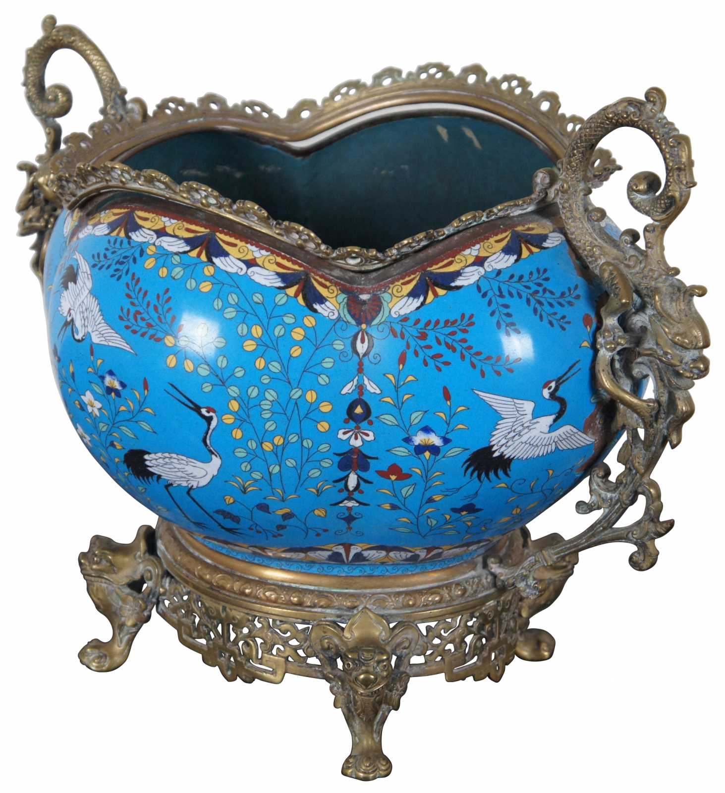 A monumental late 19th century Cloisonné jardiniere or urn with a lobed melon form body decorated with flowers and cranes on a blue ground, footed and handled with French bronze figures and pierced designs.