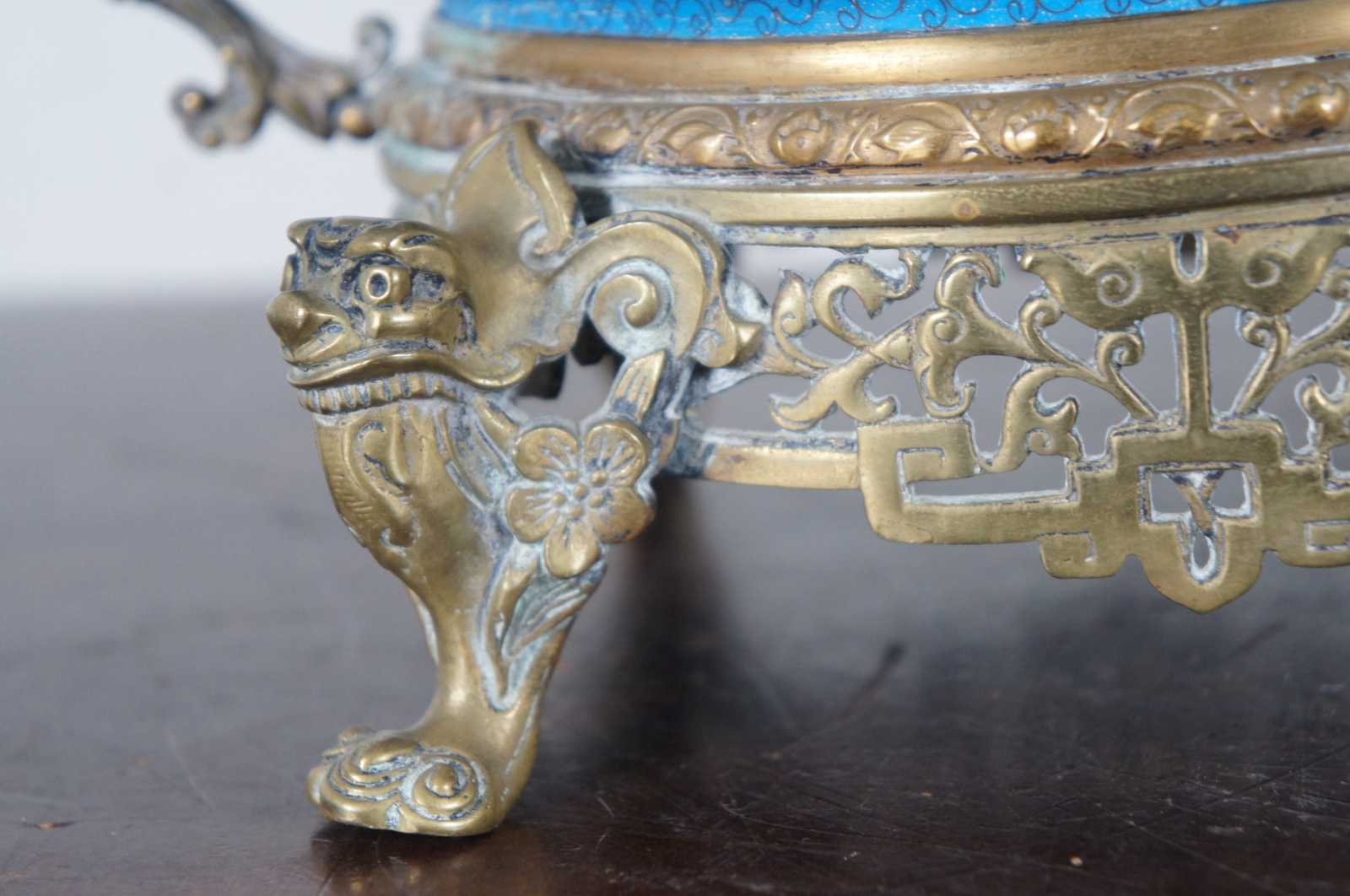 This jardinière is a truly exquisite piece of decorative art, composed of contrasting yet complementary elements. The blue cloisonné enamel body was crafted in China, then exported to France, where it was fitted with bronze mounts.