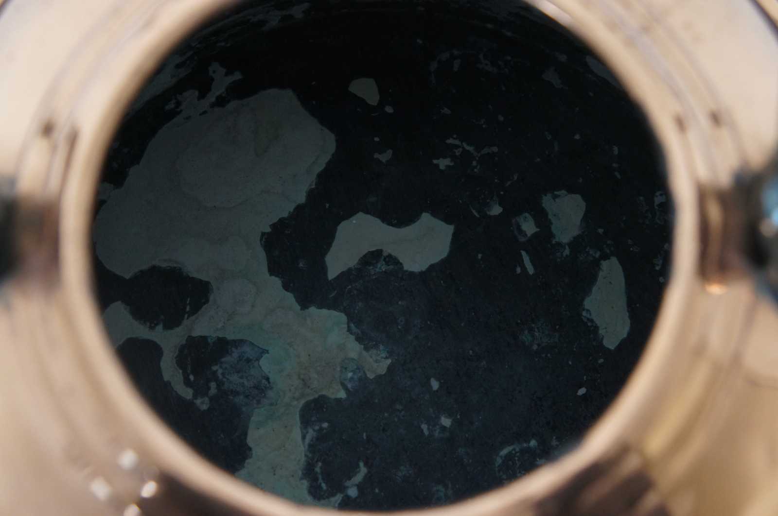 Good Overall - Some dents/spots/tarnish; crusted white residue inside; split in lid finial; see pictures