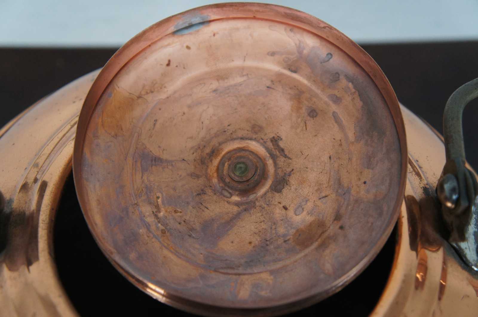 Very shiny antique copper tea kettle with straight spout and wood handle.