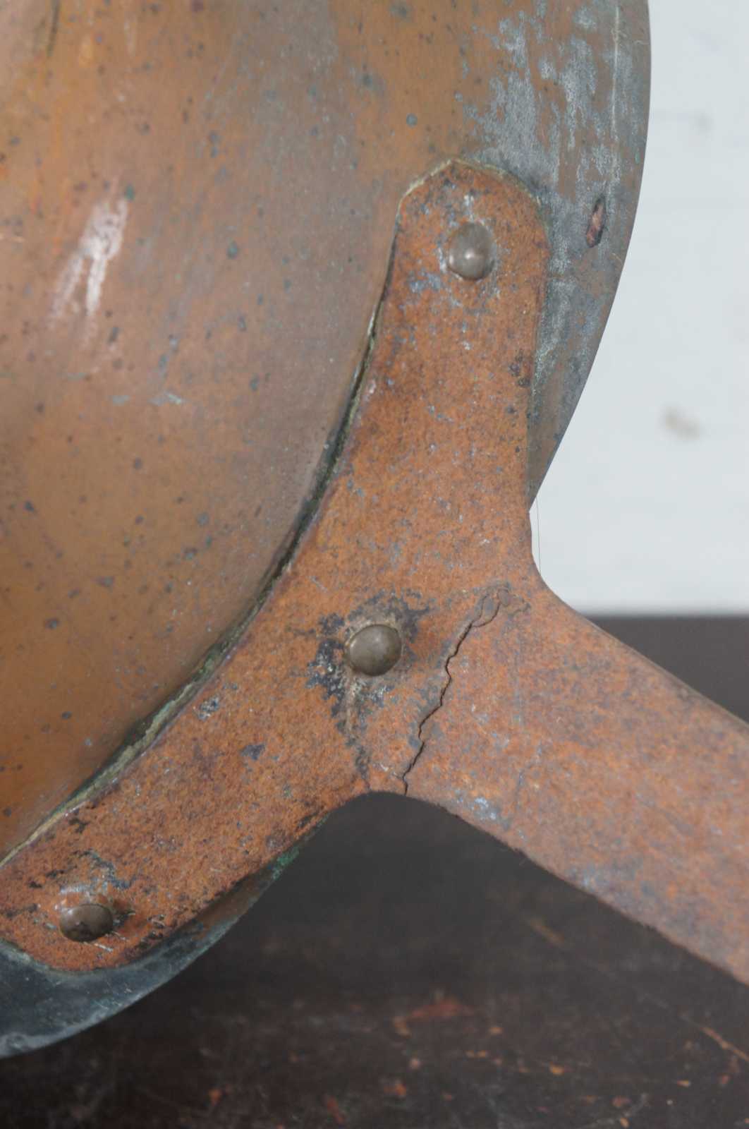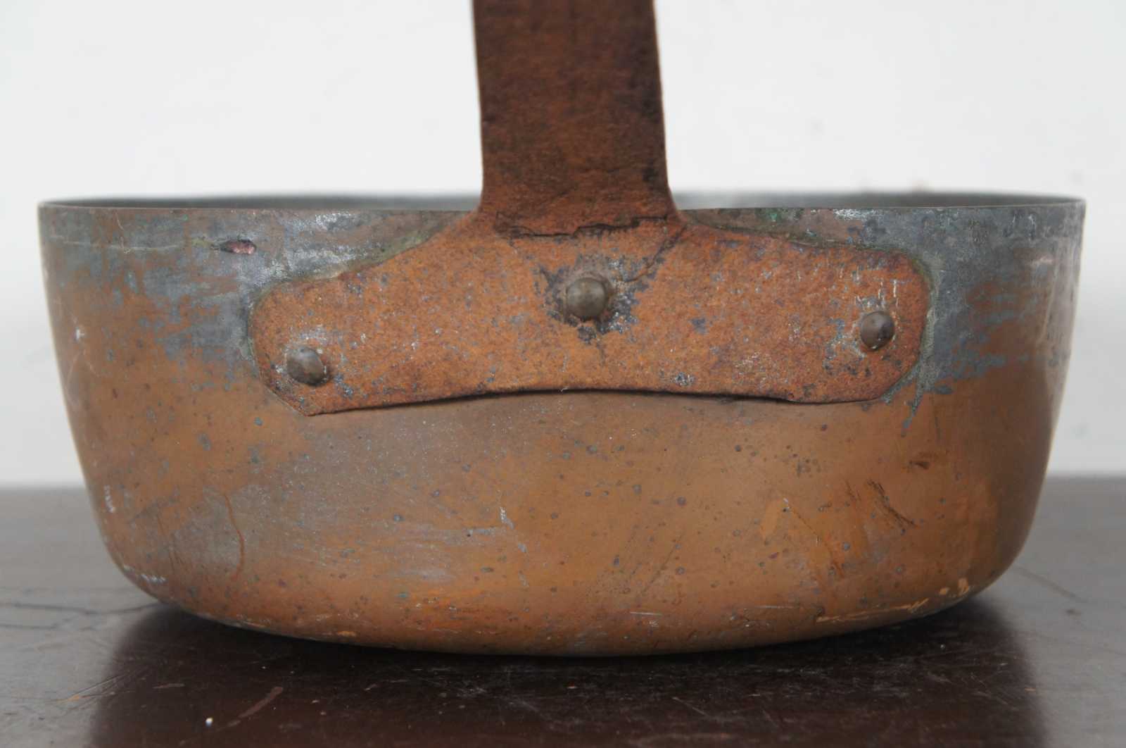 Antique copper clad sauce or saute pan with cast iron handle; capacity approximately 6 quarts.