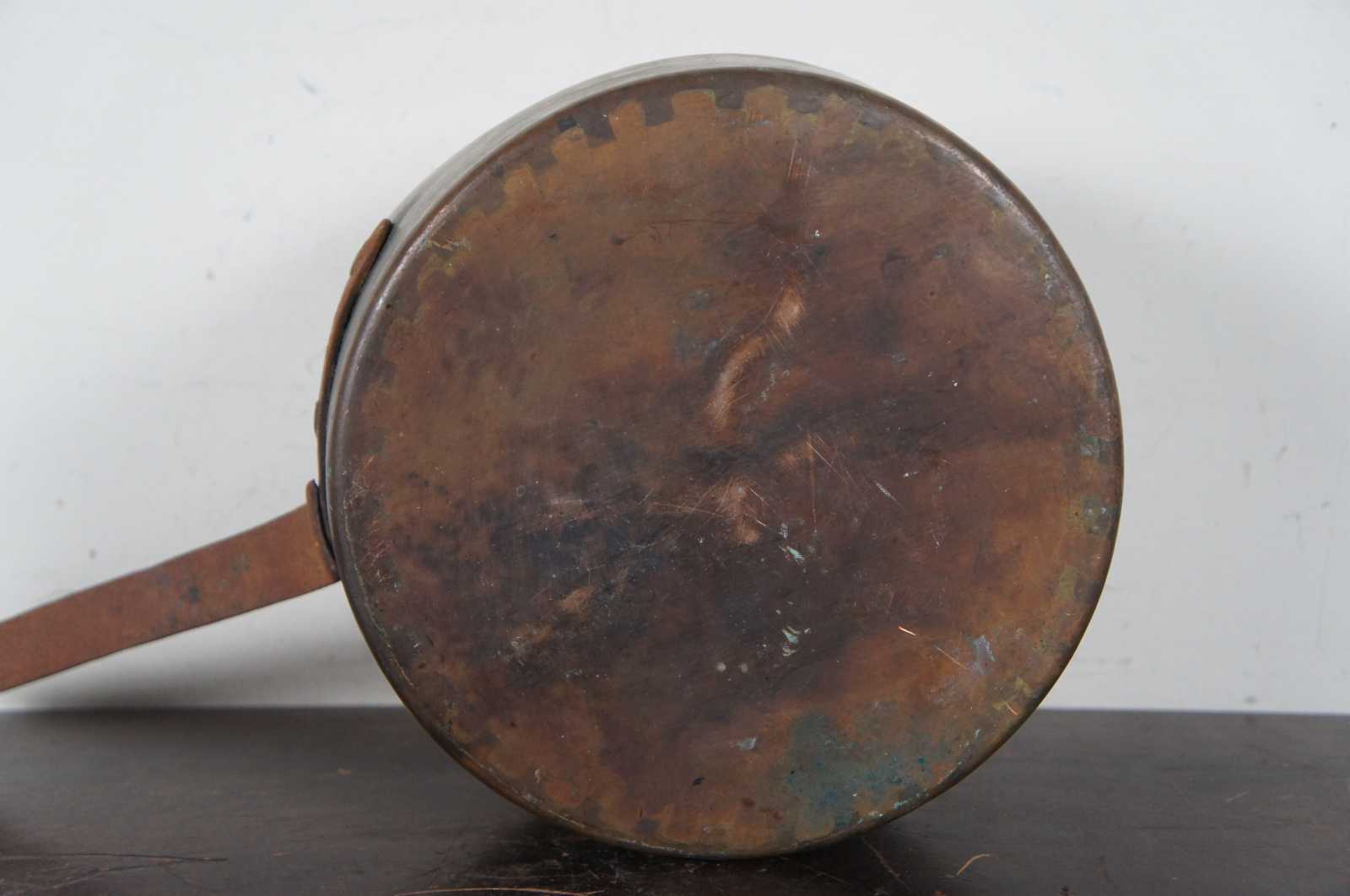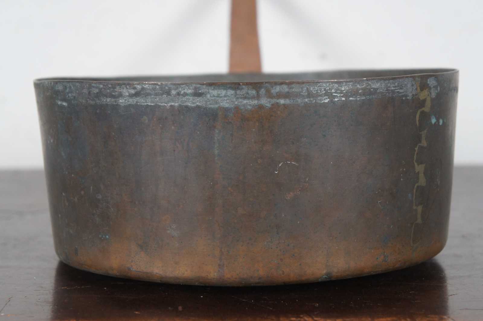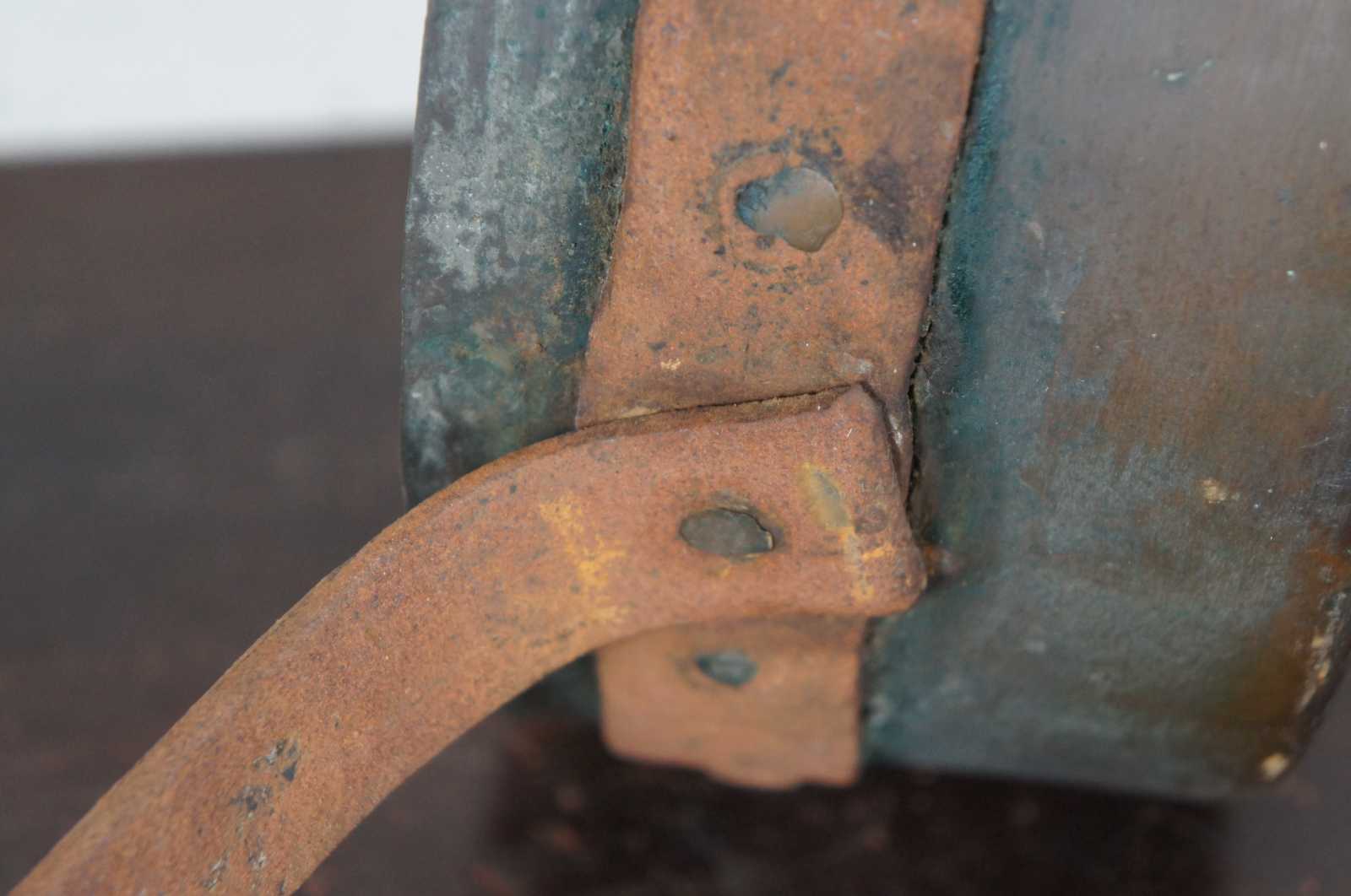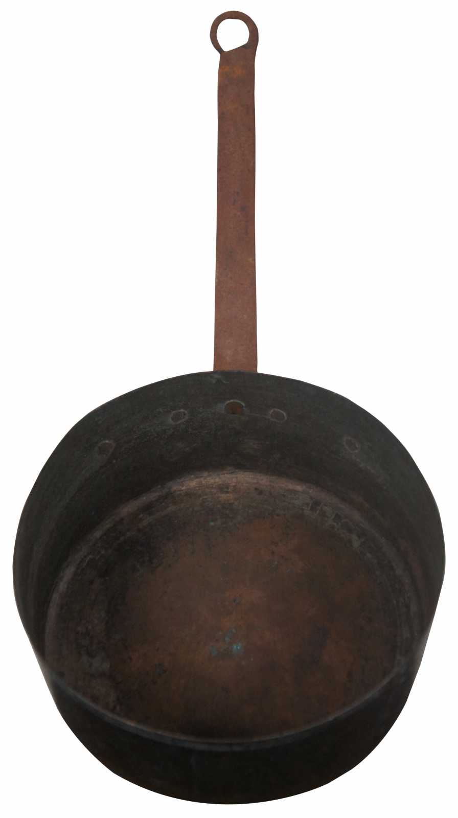 Antique copper sauce pan with cast iron handle, stamped “V.H.M.” on the side; capacity approximately 5 quarts.