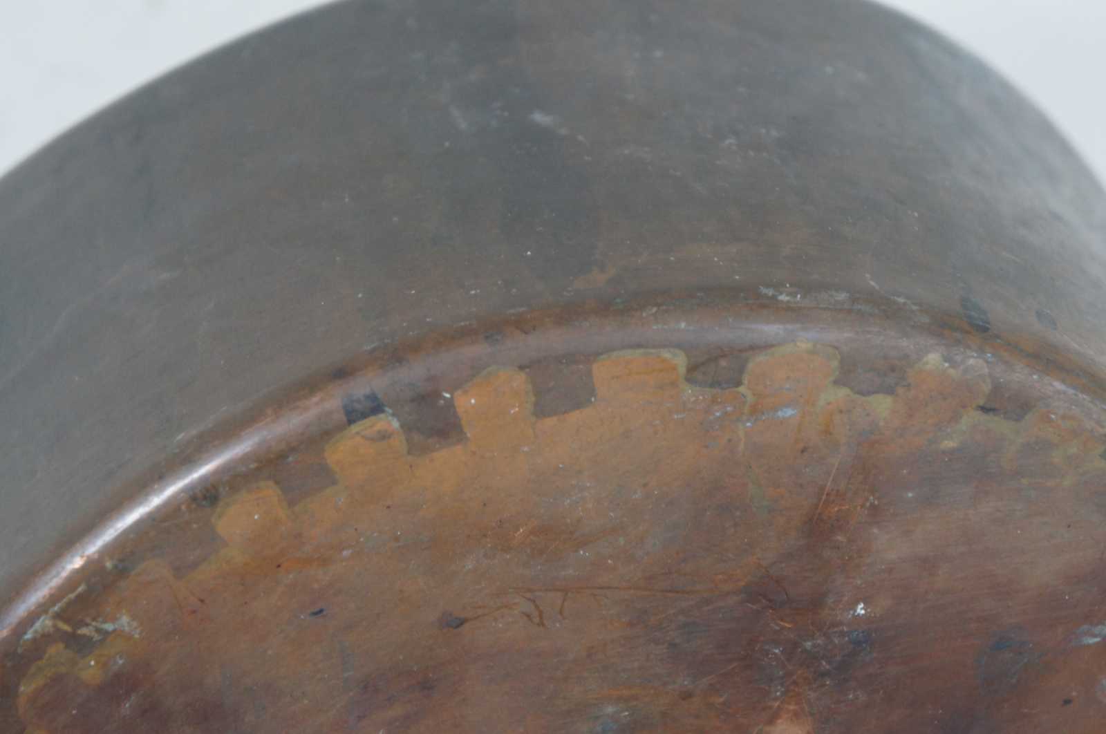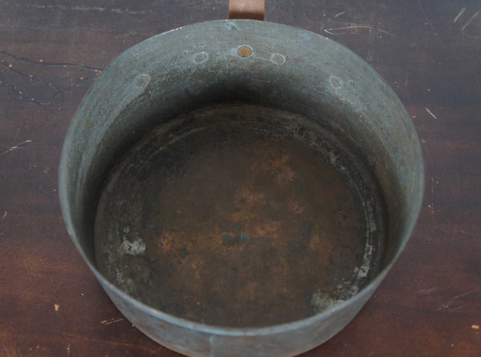 Good Overall – Marks/heavy tarnish/oxidation; rim slightly dented; handle slightly loose; see pictures