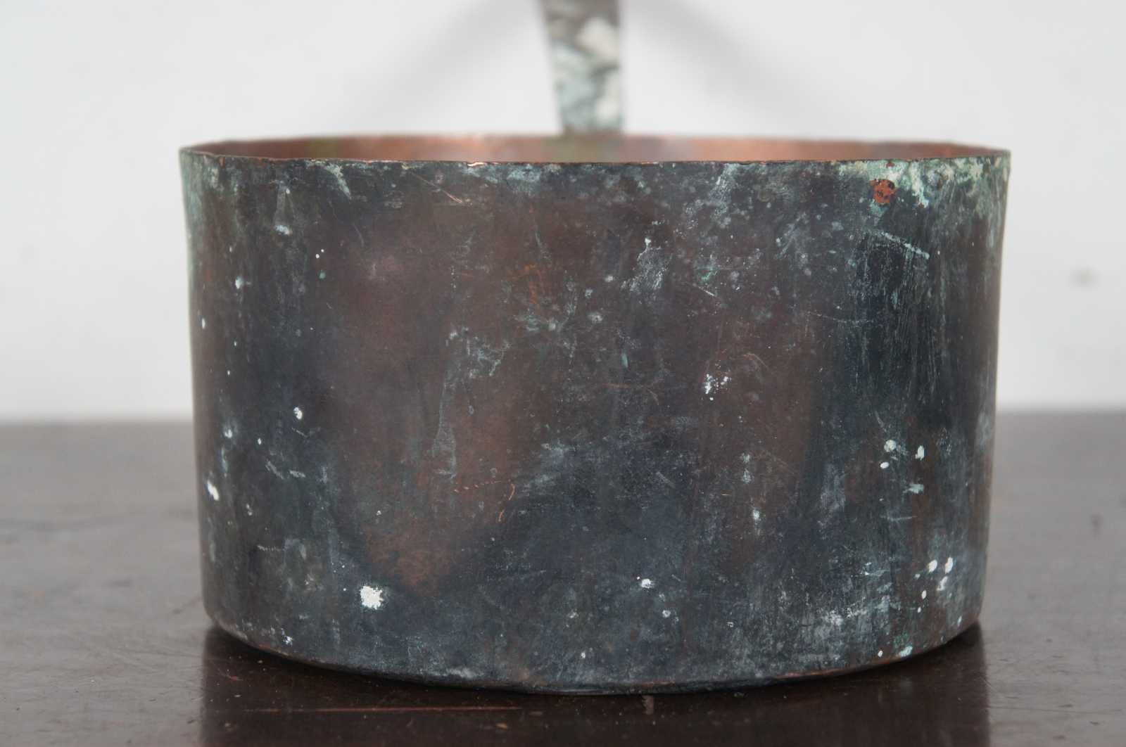 Antique copper sauce pan with cast iron handle; capacity approximately 3 quarts.