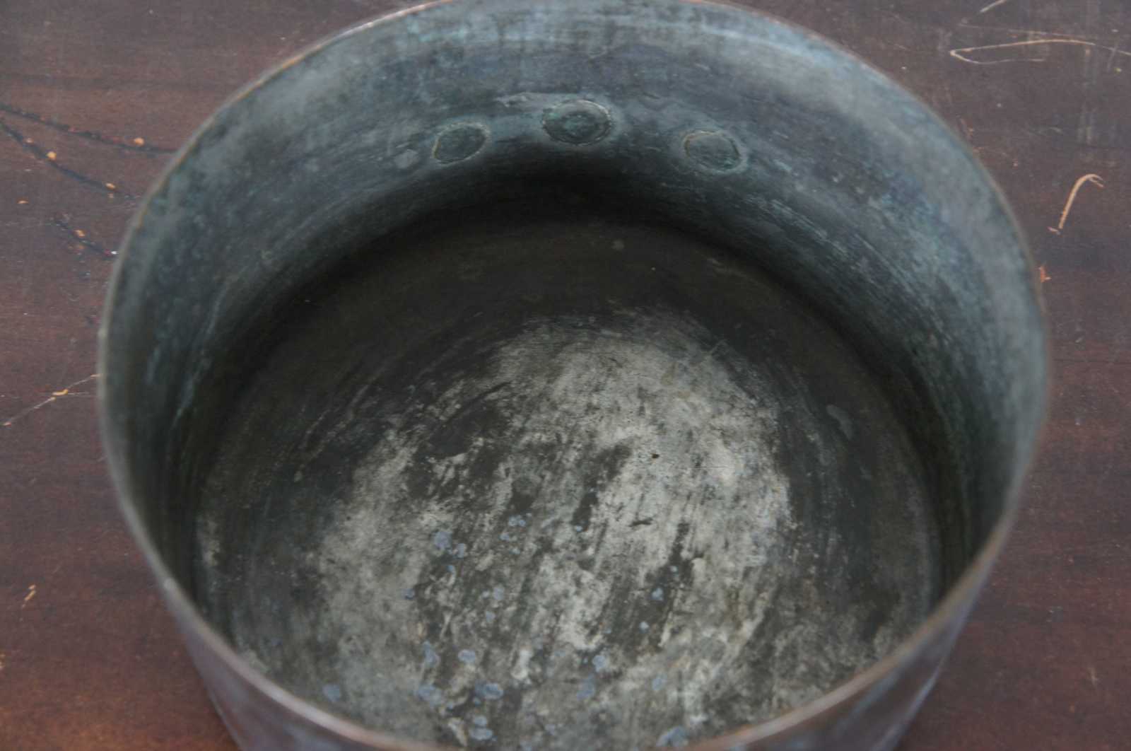 Antique copper sauce pan with cast iron handle; capacity approximately 4 quarts.