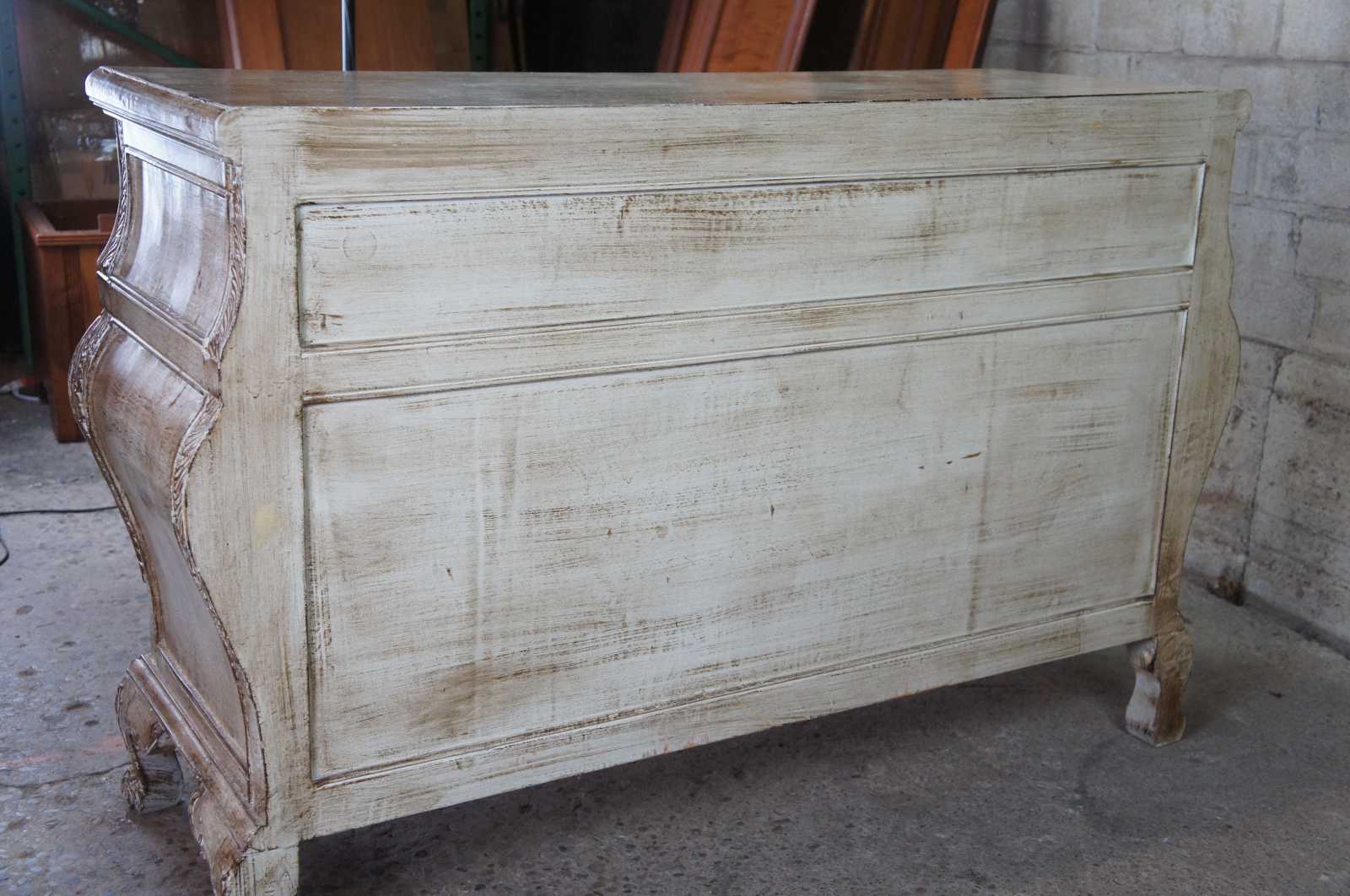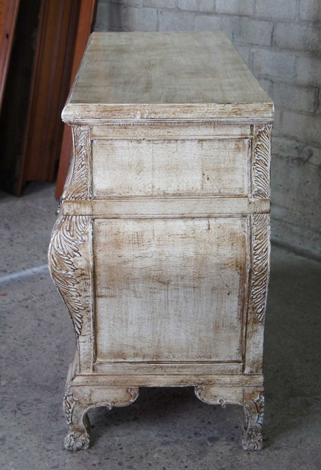 Late 20th Century Italian Revival Commode. A rectangular form with serpentine design featuring 3 dovetailed drawers over bracket feet. Includes an intricate raised acanthus deisgn along the edge. Finished in a beige white or Taupe color.